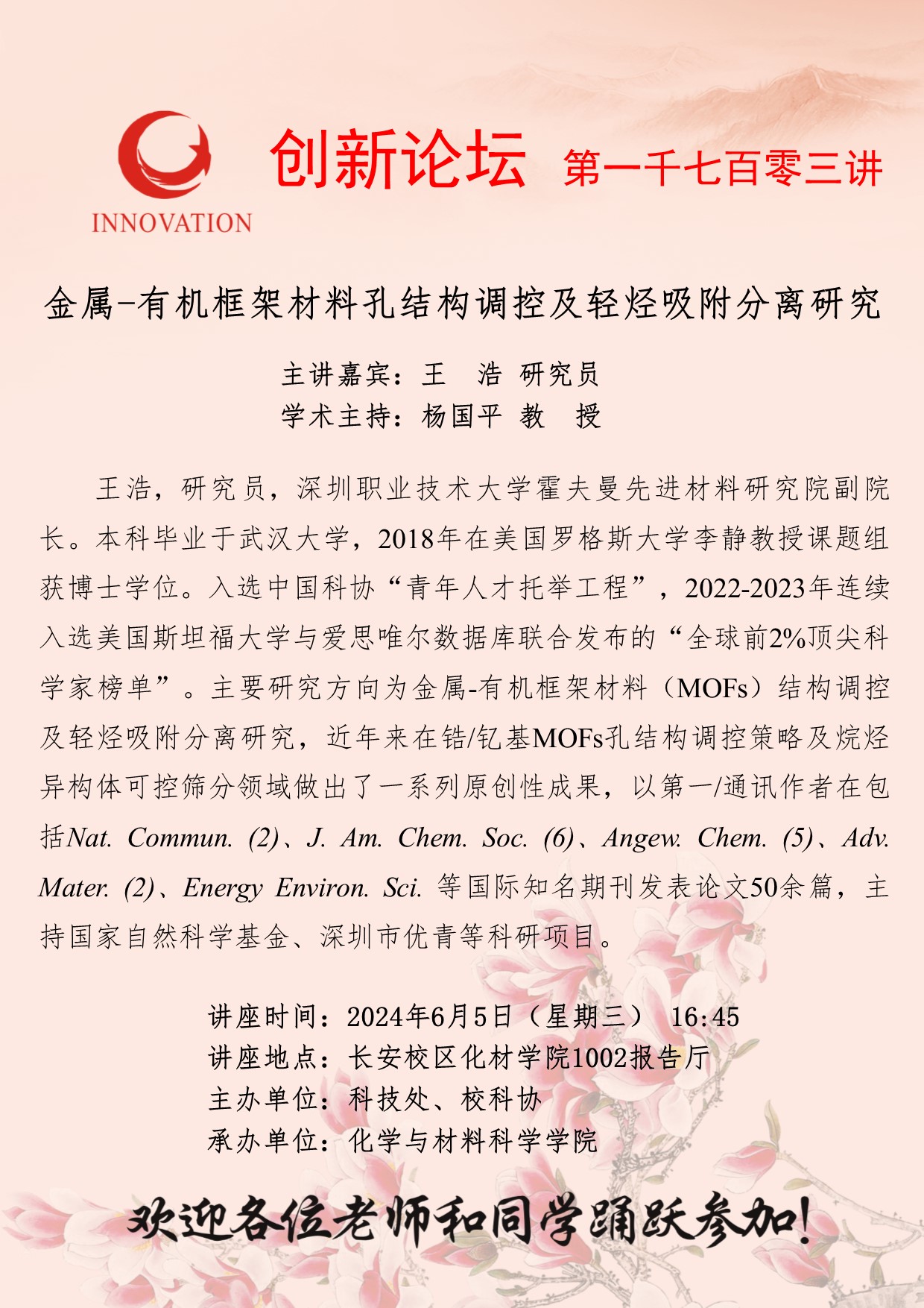 王浩 研究员 星空app官网创新论坛第一千七百零三讲:金属-有机框架材料孔结构调控及轻烃吸附分离研究 讲座时间 2024年6月5日(星期三) 16:45 讲座地点 长安校区化材学院1002报告厅 讲座人介绍 王浩 研究员 讲座内容