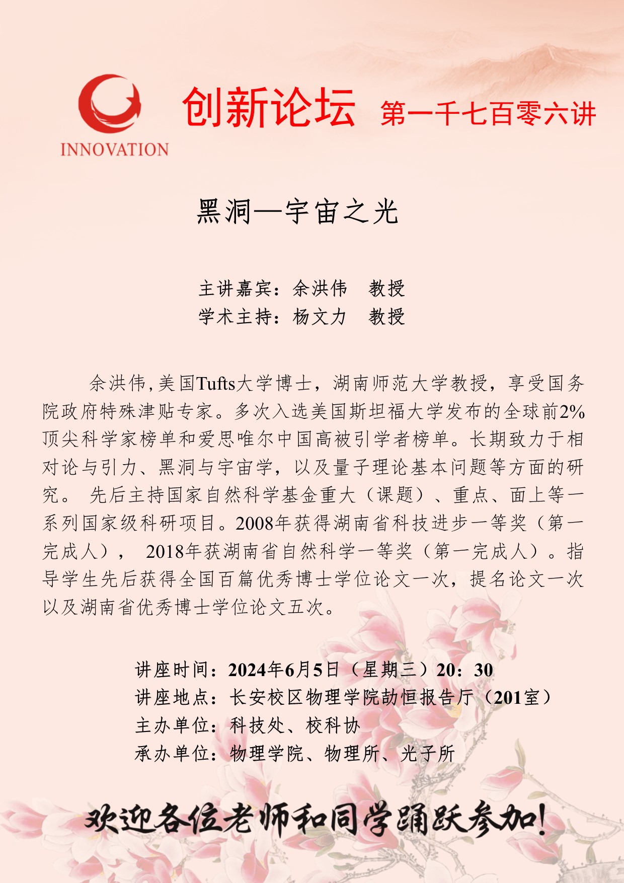 余洪伟 教授 星空app官网创新论坛第一千七百零六讲:黑洞—宇宙之光 讲座时间 2024年6月5日(星期三)20:30 讲座地点 长安校区物理学院劼恒报告厅(201室) 讲座人介绍 余洪伟 教授 讲座内容