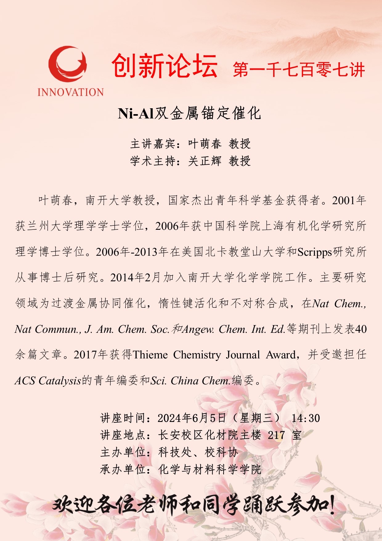 叶萌春 教授 星空app官网创新论坛第一千七百零七讲:Ni-Al双金属锚定催化 讲座时间 2024年6月5日(星期三) 14:30 讲座地点 长安校区化材院主楼 217 室 讲座人介绍 叶萌春 教授 讲座内容