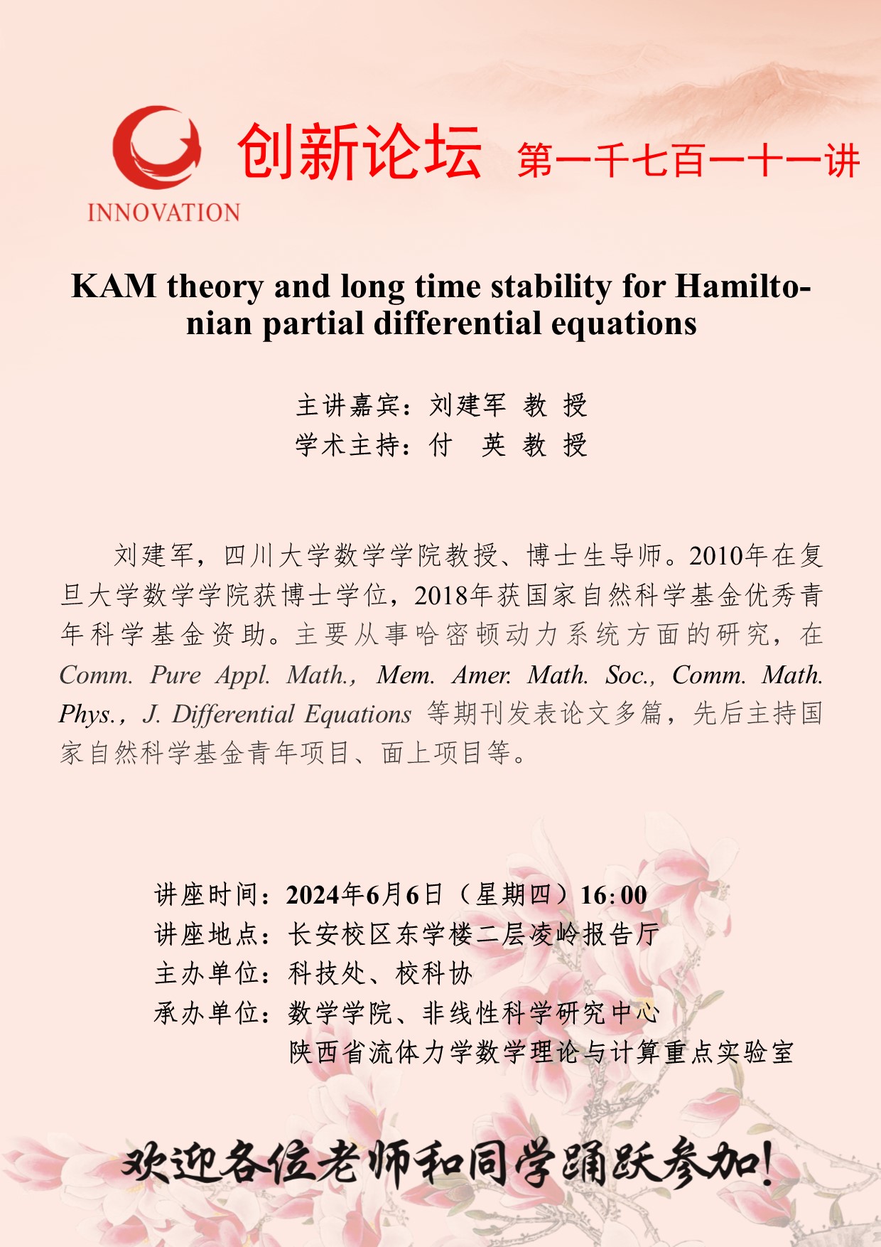 刘建军 教授 星空app官网创新论坛第一千七百一十一讲:KAM theory and long time stability for Hamiltonian partial differential equations 讲座时间 2024年6月6日(星期四)16:00 讲座地点 长安校区东学楼二层凌岭报告厅 讲座人介绍 刘建军 教授 讲座内容