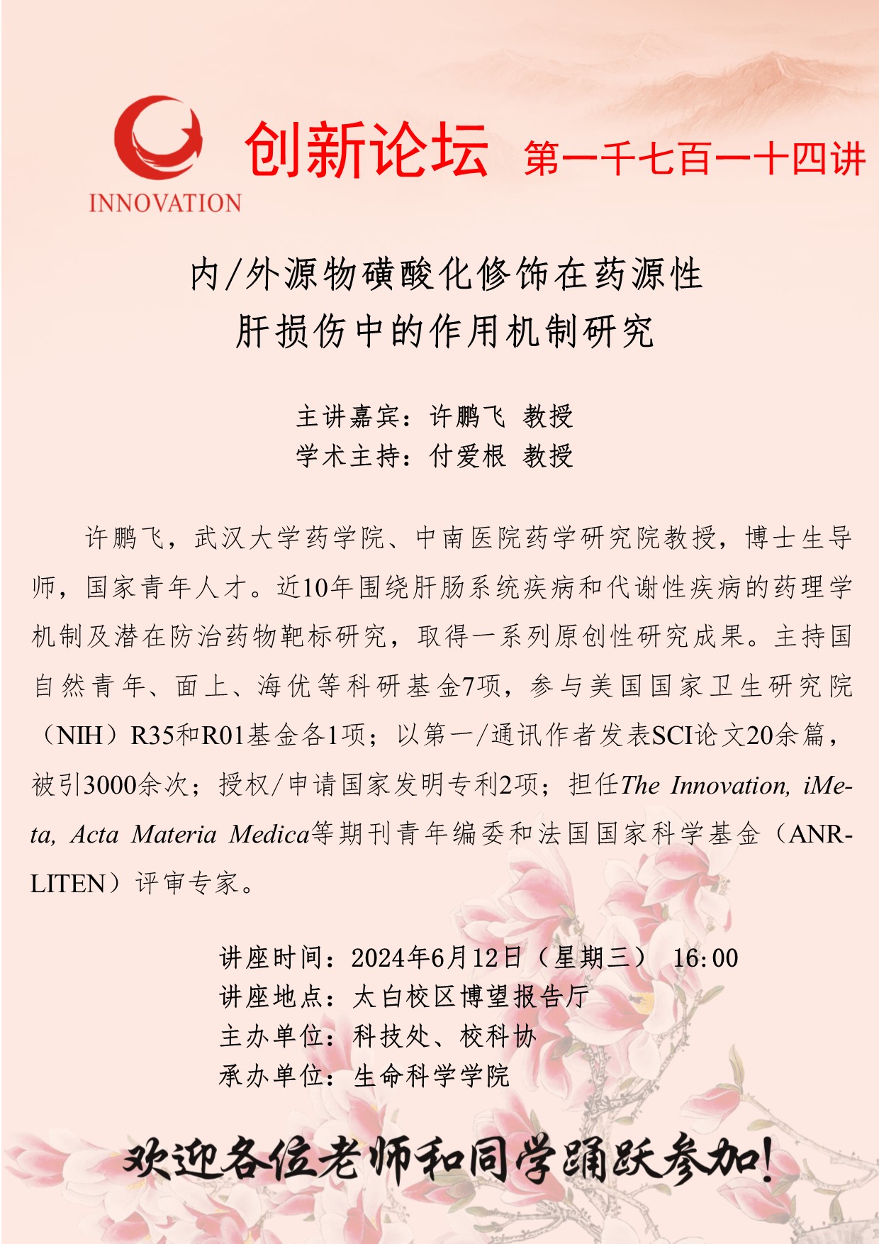许鹏飞 教授 星空app官网创新论坛第一千七百一十四讲:内/外源物磺酸化修饰在药源性肝损伤中的作用机制研究 讲座时间 2024年6月12日(星期三) 16:00 讲座地点 太白校区博望报告厅 讲座人介绍 许鹏飞 教授 讲座内容