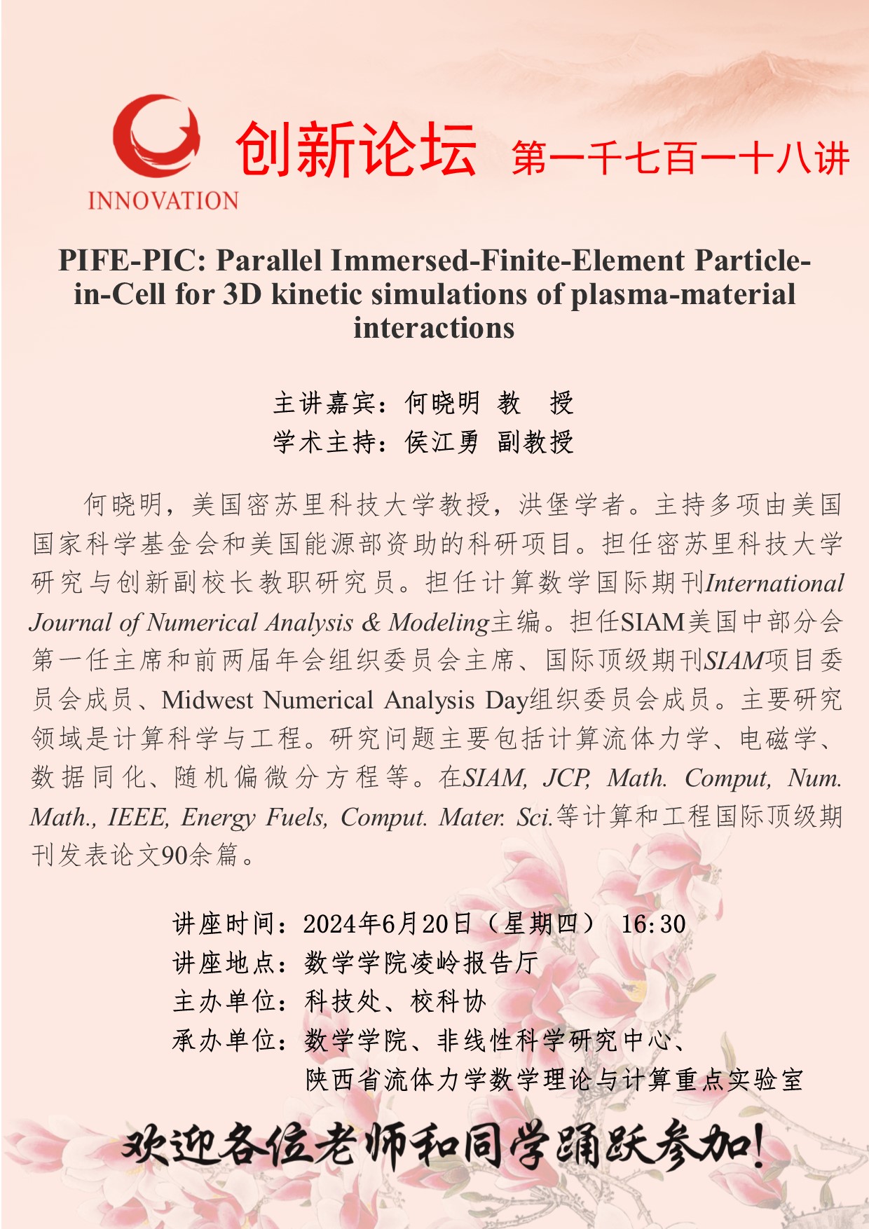 何晓明 教授 星空app官网创新论坛第一千七百一十八讲:PIFE-PIC: Parallel Immersed-Finite-Element Particle-in-Cell for 3D kinetic simulations of plasma-material interactions 讲座时间 2024年6月20日(星期四) 16:30 讲座地点 数学学院凌岭报告厅 讲座人介绍 何晓明 教授 讲座内容