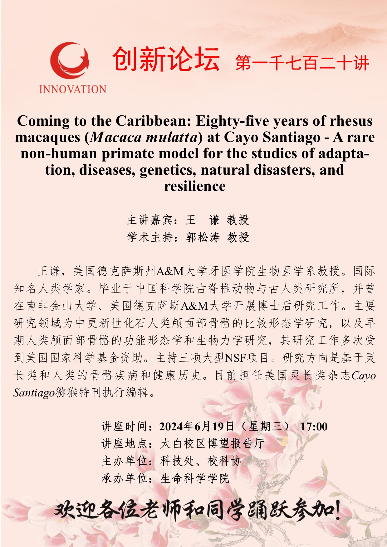 王谦 教授 星空app官网创新论坛第一千七百二十讲:Coming to the Caribbean: Eighty-five years of rhesus macaques (Macaca mulatta) at Cayo Santiago - A rare non-human primate model for the studies of adaptation, diseases, genetics, natural disasters, and resilience 讲座时间 2024年6月19日(星期三) 17:00 讲座地点 太白校区博望报告厅 讲座人介绍 王谦 教授 讲座内容