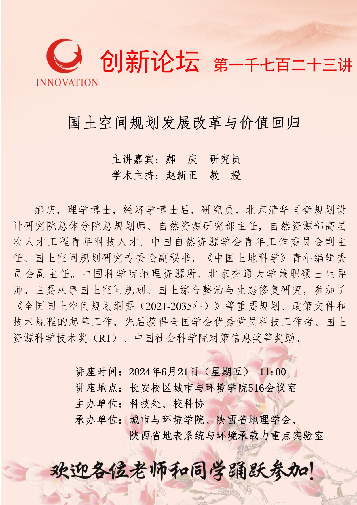 郝庆 研究员 星空app官网创新论坛第一千七百二十三讲:国土空间规划发展改革与价值回归 讲座时间 2024年6月21日(星期五) 11:00 讲座地点 长安校区城市与环境学院516会议室 讲座人介绍 郝庆 研究员 讲座内容