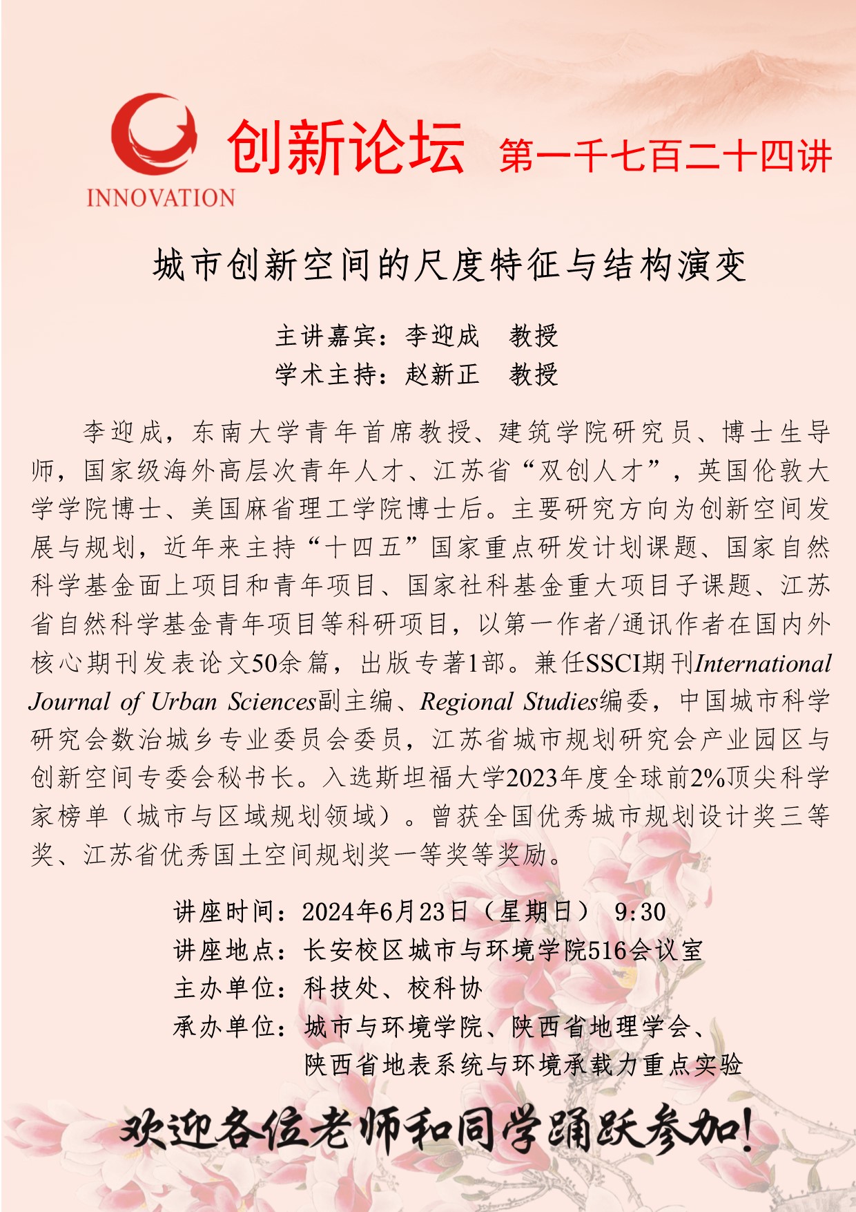 李迎成 教授 星空app官网创新论坛第一千七百二十四讲:城市创新空间的尺度特征与结构演变 讲座时间 2024年6月23日(星期日) 9:30 讲座地点 长安校区城市与环境学院516会议室 讲座人介绍 李迎成 教授 讲座内容