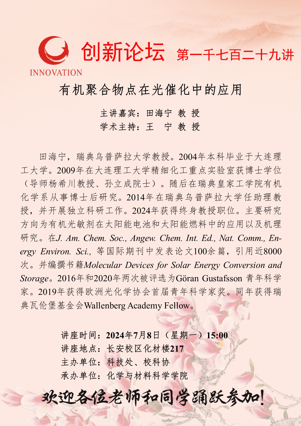 田海宁 教授 星空app官网创新论坛第一千七百二十九讲:有机聚合物点在光催化中的应用 讲座时间 2024年7月8日(星期一)15:00 讲座地点 长安校区化材楼217 讲座人介绍 田海宁 教授 讲座内容