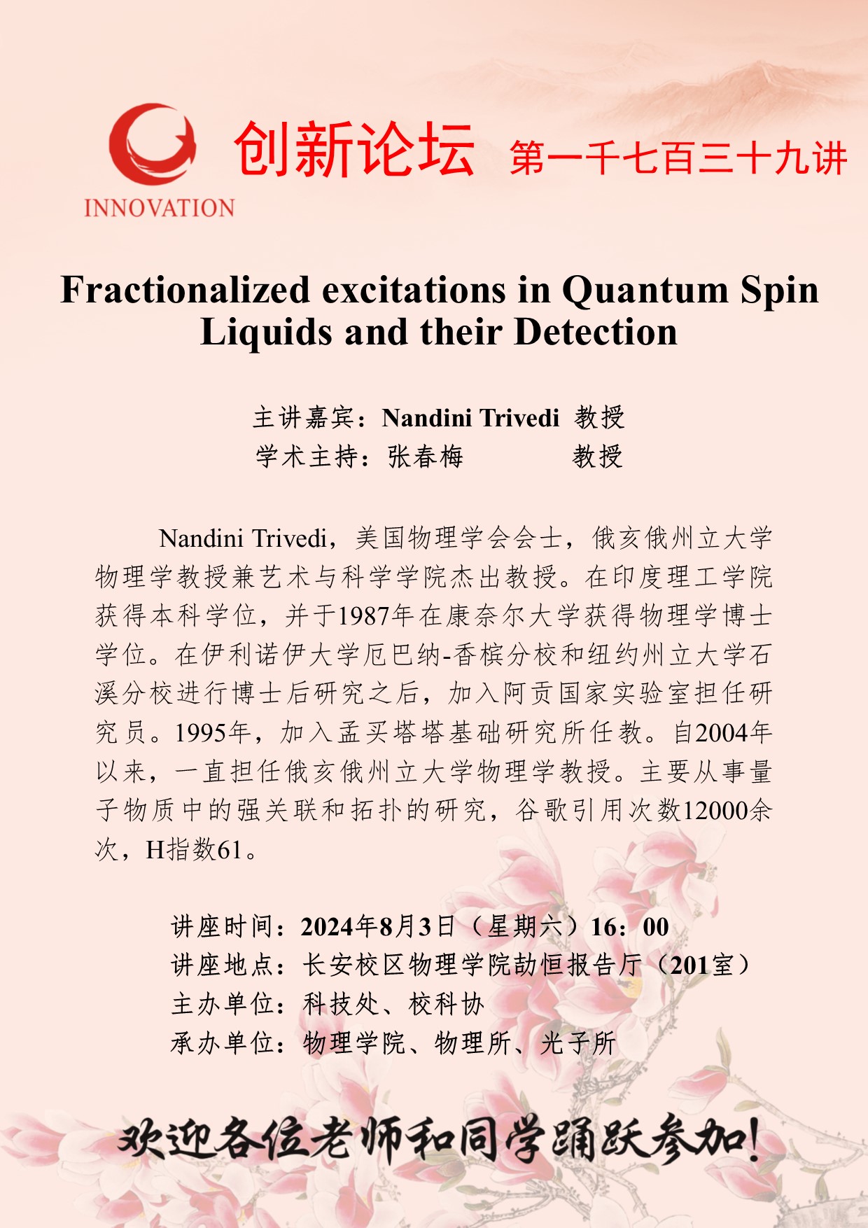 Nandini Trivedi 教授 星空app官网创新论坛第一千七百三十九讲:Fractionalized excitations in Quantum Spin Liquids and their Detection 讲座时间 2024年8月3日(星期六)16:00 讲座地点 长安校区物理学院劼恒报告厅(201室) 讲座人介绍 Nandini Trivedi 教授 讲座内容