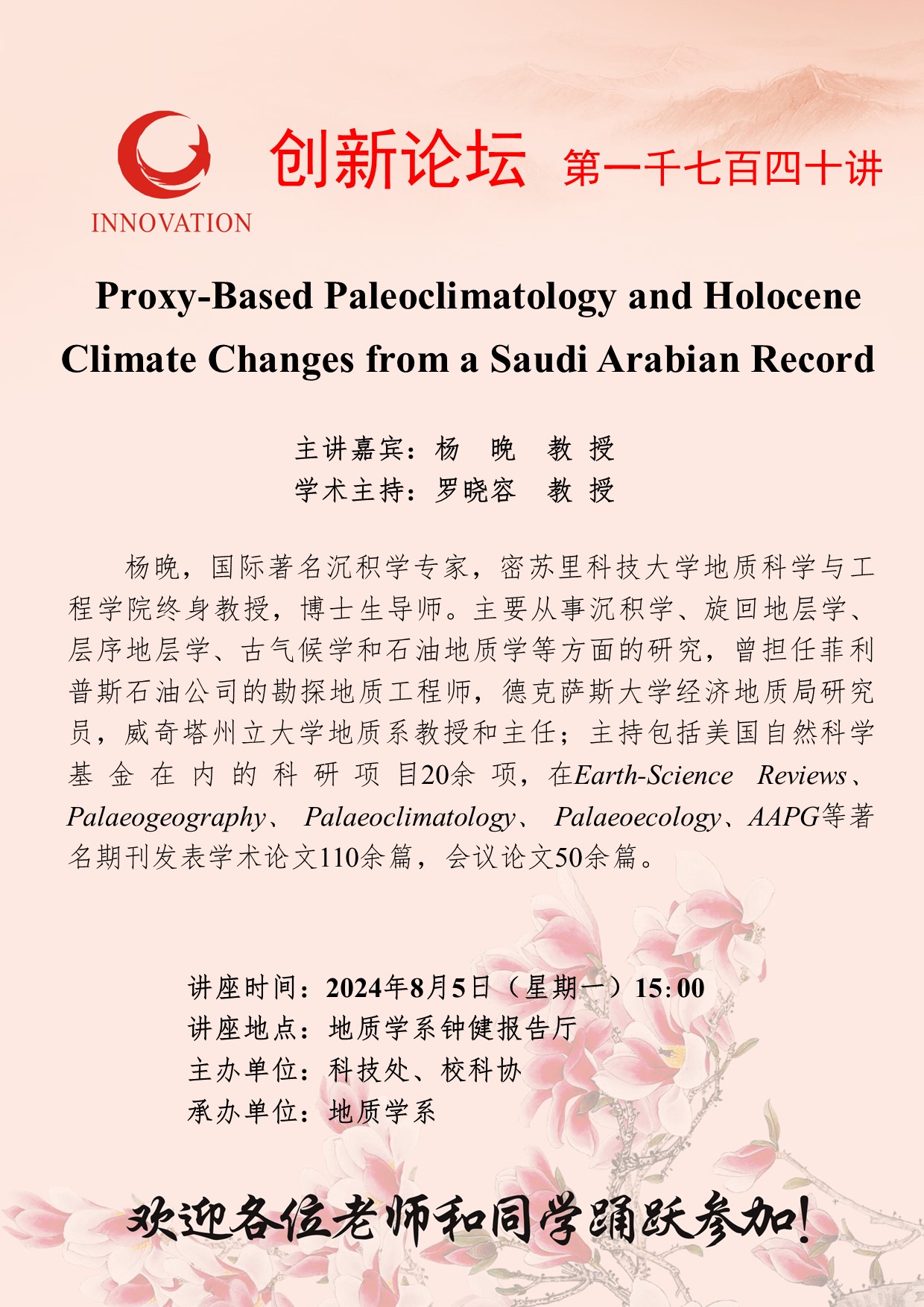 杨晚 教授 星空app官网创新论坛第一千七百四十讲: Proxy-Based Paleoclimatology and Holocene Climate Changes from a Saudi Arabian Record 讲座时间 2024年8月5日(星期一)15:00 讲座地点 地质学系钟健报告厅 讲座人介绍 杨晚 教授 讲座内容