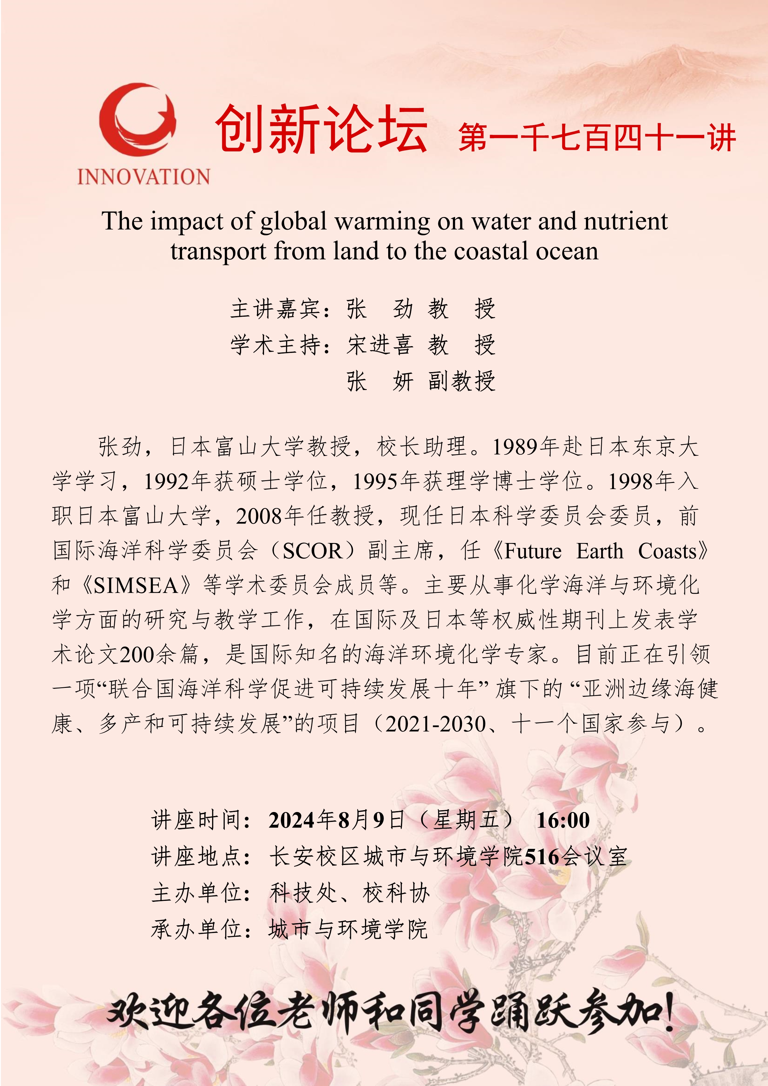张劲 教授 星空app官网创新论坛第一千七百四十一讲:The impact of global warming on water and nutrient transport from land to the coastal ocean 讲座时间 2024年8月9日(星期五)16:00 讲座地点 长安校区城市与环境学院516会议室 讲座人介绍 张劲 教授 讲座内容