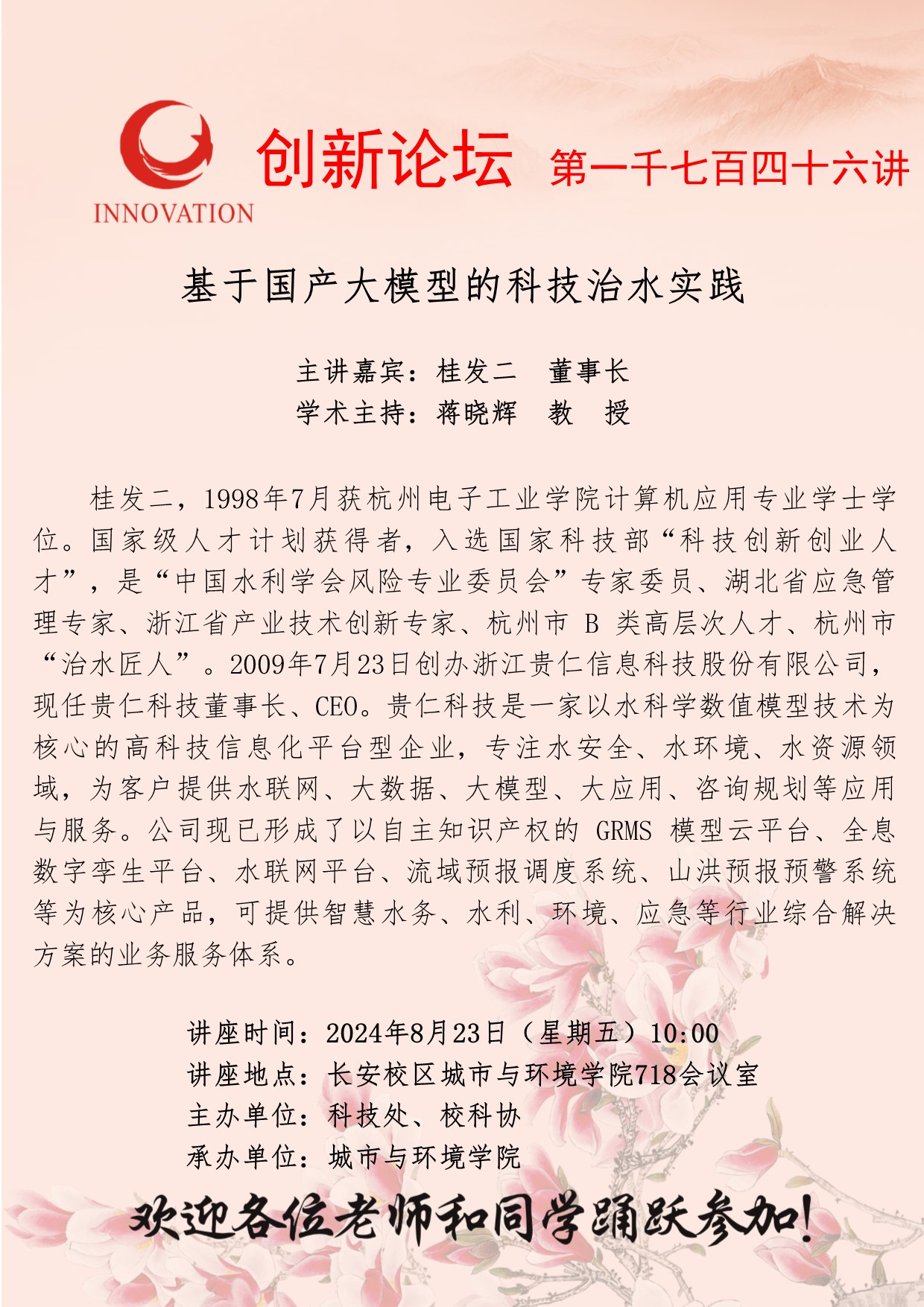 桂发二 董事长 星空app官网创新论坛第一千七百四十六讲:基于国产大模型的科技治水实践 讲座时间 2024年8月23日(星期五)10:00 讲座地点 长安校区城市与环境学院718会议室 讲座人介绍 桂发二 董事长 讲座内容