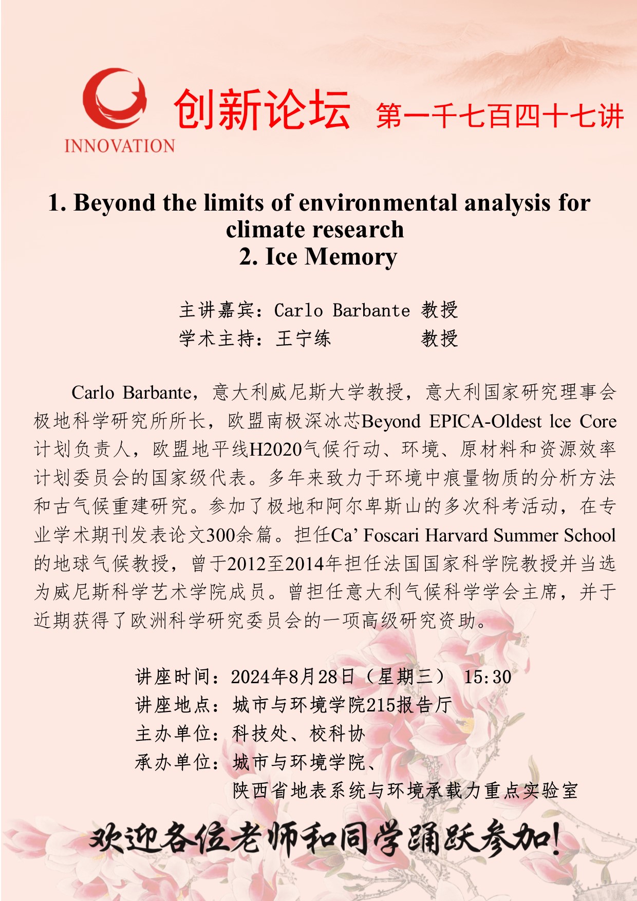 Carlo Barbante 教授 星空app官网创新论坛第一千七百四十七讲:1. Beyond the limits of environmental analysis for climate research 2. Ice Memory 讲座时间 2024年8月28日(星期三) 15:30 讲座地点 城市与环境学院215报告厅 讲座人介绍 Carlo Barbante 教授 讲座内容