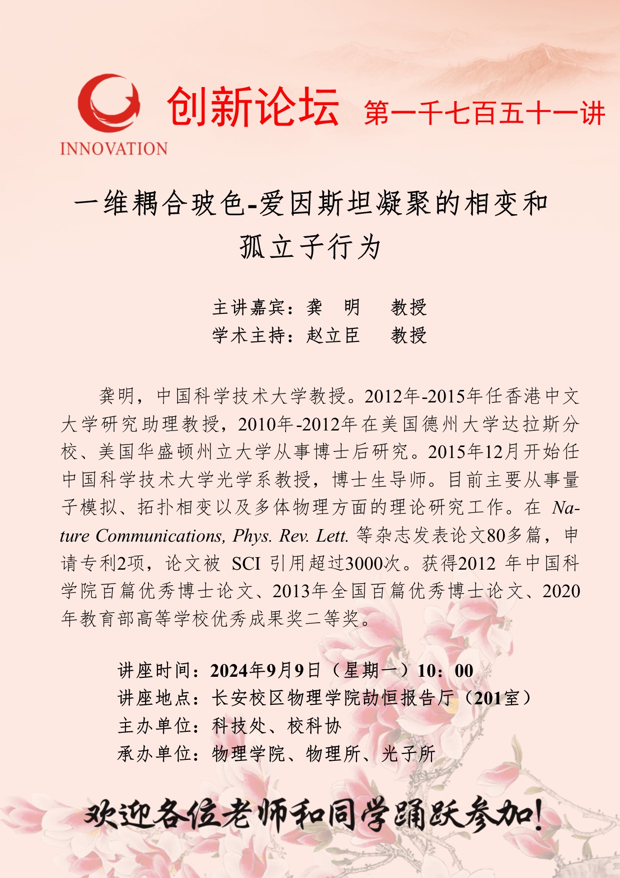 龚明 教授 星空app官网创新论坛第一千七百五十一讲:一维耦合玻色-爱因斯坦凝聚的相变和孤立子行为 讲座时间 2024年9月9日(星期一)10:00 讲座地点 长安校区物理学院劼恒报告厅(201室) 讲座人介绍 龚明 教授 讲座内容