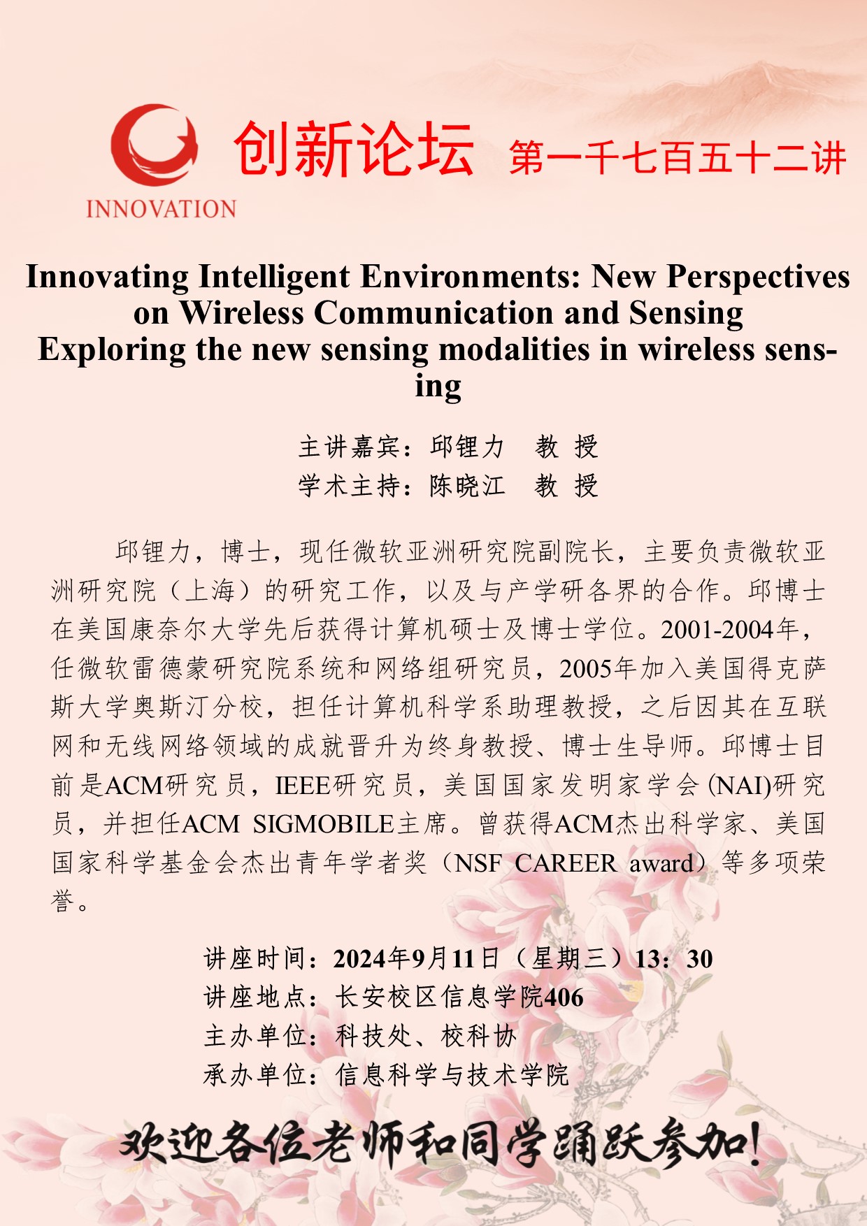 邱锂力 教授 星空app官网创新论坛第一千七百五十二讲:Innovating Intelligent Environments: New Perspectives on Wireless Communication and Sensing Exploring the new sensing modalities in wireless sensing 讲座时间 2024年9月11日(星期三)13:30 讲座地点 长安校区信息学院406 讲座人介绍 邱锂力 教授 讲座内容