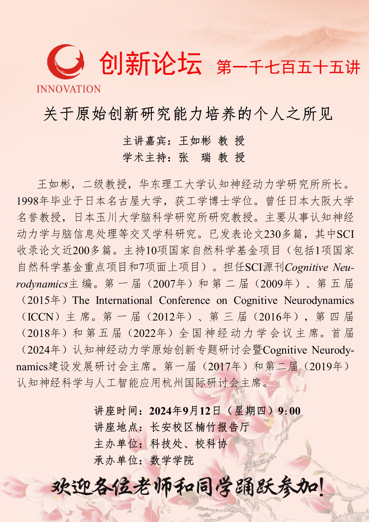 王如彬 教授 星空app官网创新论坛第一千七百五十五讲:关于原始创新研究能力培养的个人之所见 讲座时间 2024年9月12日(星期四)9:00 讲座地点 长安校区楠竹报告厅 讲座人介绍 王如彬 教授 讲座内容