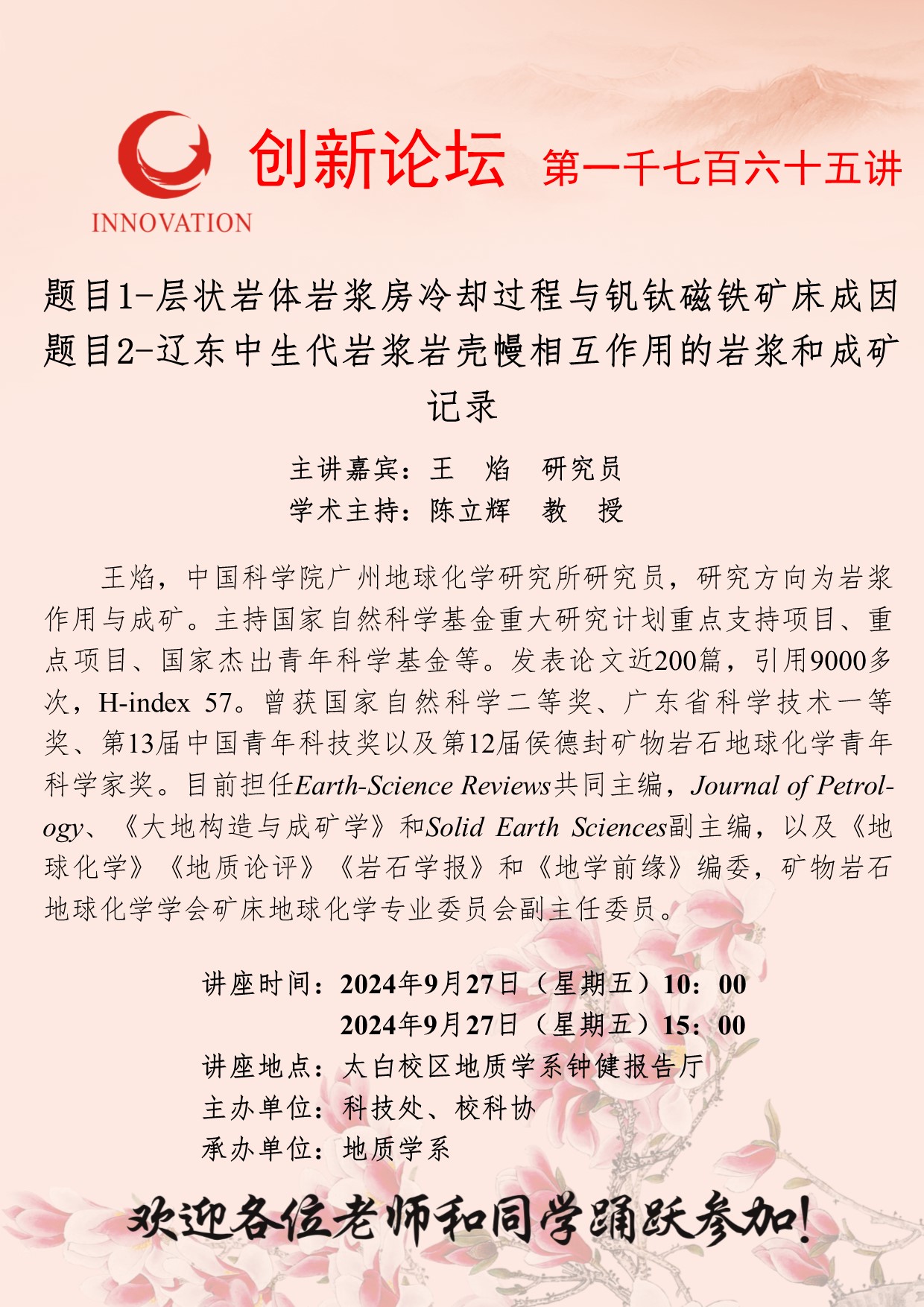 王焰 研究员 星空app官网创新论坛第一千七百六十五讲:题目1-层状岩体岩浆房冷却过程与钒钛磁铁矿床成因 题目2-辽东中生代岩浆岩壳幔相互作用的岩浆和成矿记录 讲座时间 2024年9月27日(星期五)10:00 2024年9月27日(星期五)15:00 讲座地点 太白校区地质学系钟健报告厅 讲座人介绍 王焰 研究员 讲座内容