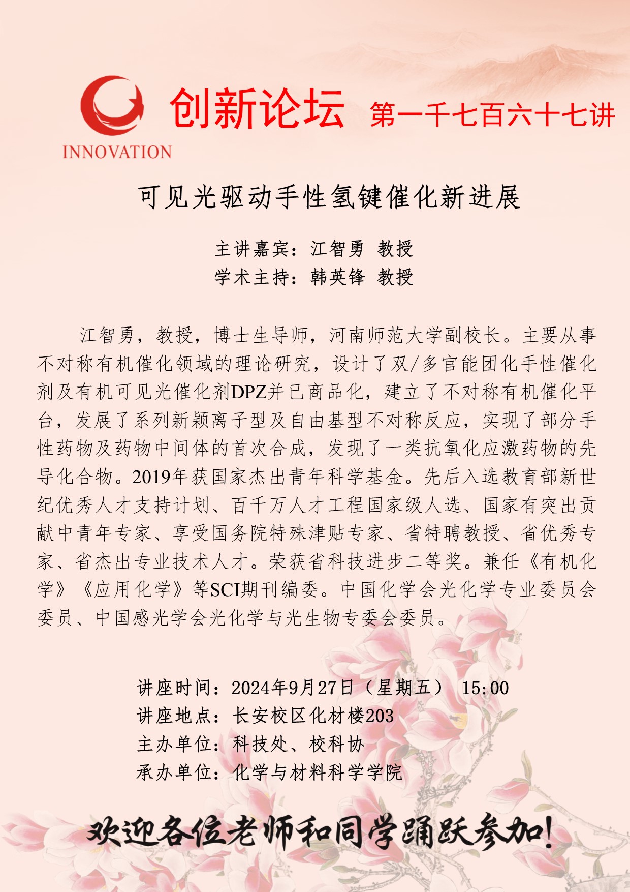 江智勇 教授 星空app官网创新论坛第一千七百六十七讲:可见光驱动手性氢键催化新进展 讲座时间 2024年9月27日(星期五) 15:00 讲座地点 长安校区化材楼203 讲座人介绍 江智勇 教授 讲座内容