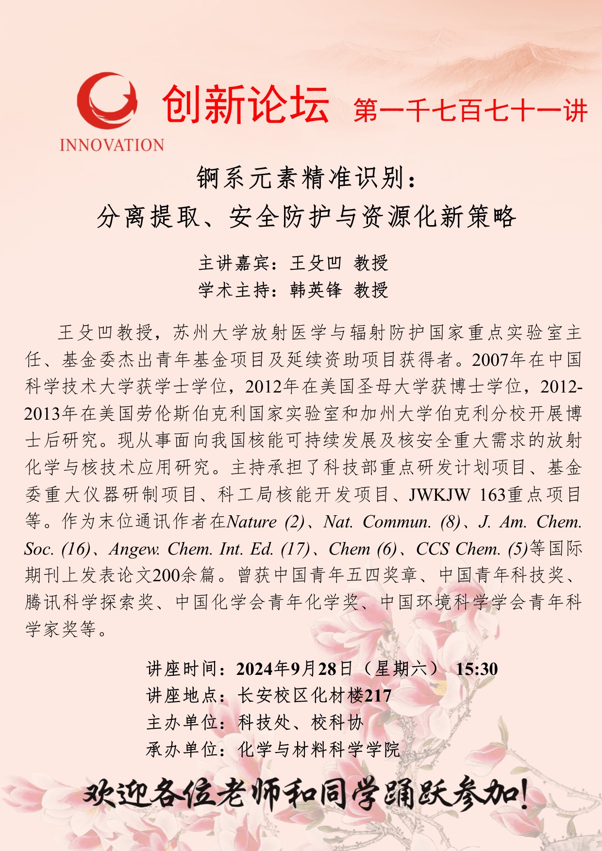 王殳凹 教授 星空app官网创新论坛第一千七百七十一讲:锕系元素精准识别:分离提取、安全防护与资源化新策略 讲座时间 2024年9月28日(星期六) 15:30 讲座地点 长安校区化材楼217 讲座人介绍 王殳凹 教授 讲座内容