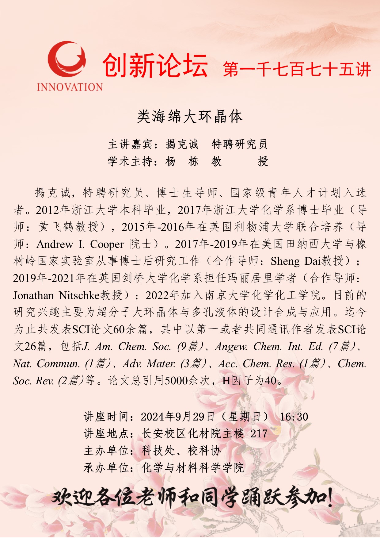 揭克诚 特聘研究员 星空app官网创新论坛第一千七百七十五讲:类海绵大环晶体 讲座时间 2024年9月29日(星期日) 16:30 讲座地点 长安校区化材院主楼 217 讲座人介绍 揭克诚 特聘研究员 讲座内容