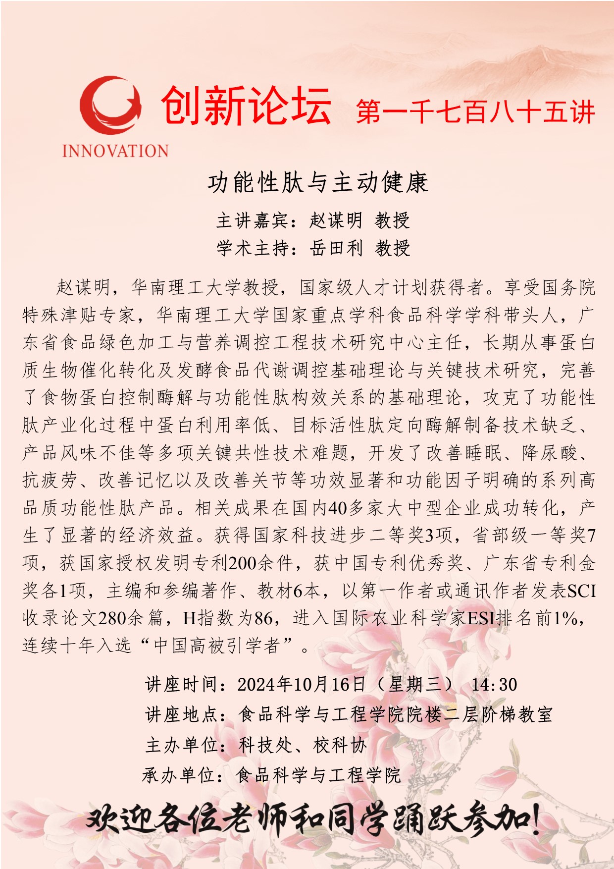 赵谋明 教授 星空app官网创新论坛第一千七百八十五讲:功能性肽与主动健康 讲座时间 2024年10月16日(星期三) 14:30 讲座地点 食品科学与工程学院院楼二层阶梯教室 讲座人介绍 赵谋明 教授 讲座内容