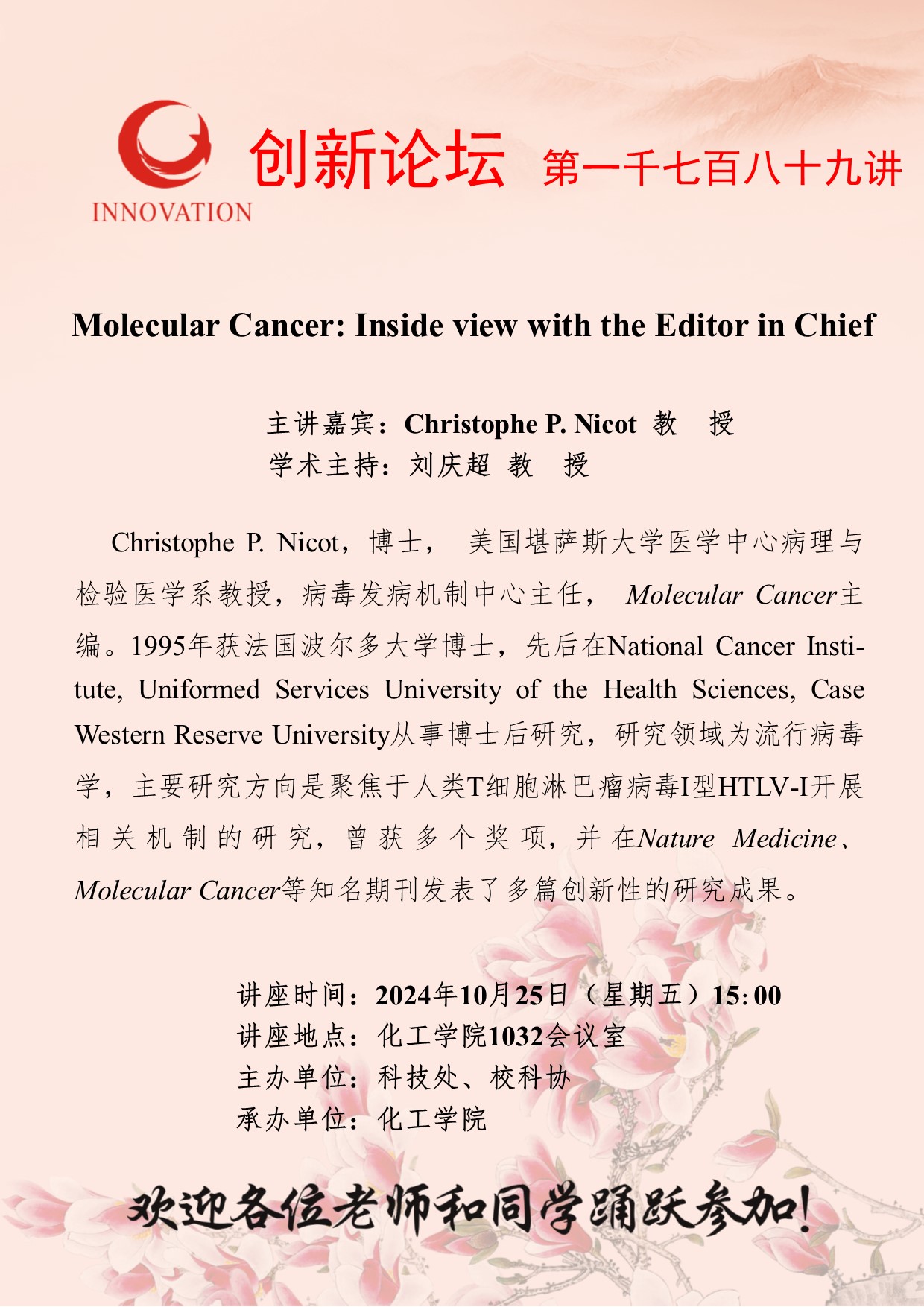 Christophe P. Nicot 教授 星空app官网创新论坛第一千七百八十九讲:Molecular Cancer: Inside view with the Editor in Chief 讲座时间 2024年10月25日(星期五)15:00 讲座地点 化工学院1032会议室 讲座人介绍 Christophe P. Nicot 教授 讲座内容