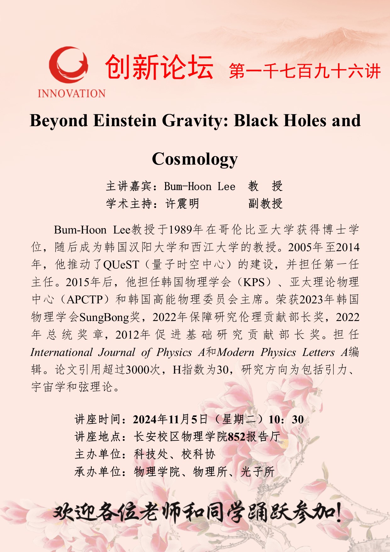 Bum-Hoon Lee 教授 星空app官网创新论坛第一千七百九十六讲:Beyond Einstein Gravity: Black Holes and Cosmology 讲座时间 2024年11月5日(星期二)10:30 讲座地点 长安校区物理学院852报告厅 讲座人介绍 Bum-Hoon Lee 教授 讲座内容