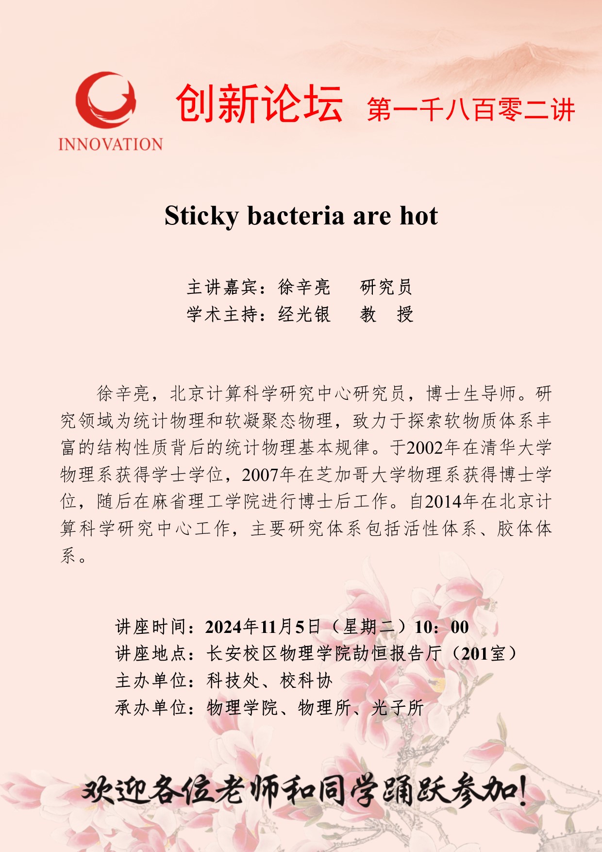徐辛亮 研究员 星空app官网创新论坛第一千八百零二讲:Sticky bacteria are hot 讲座时间 2024年11月5日(星期二)10:00 讲座地点 长安校区物理学院劼恒报告厅(201室) 讲座人介绍 徐辛亮 研究员 讲座内容
