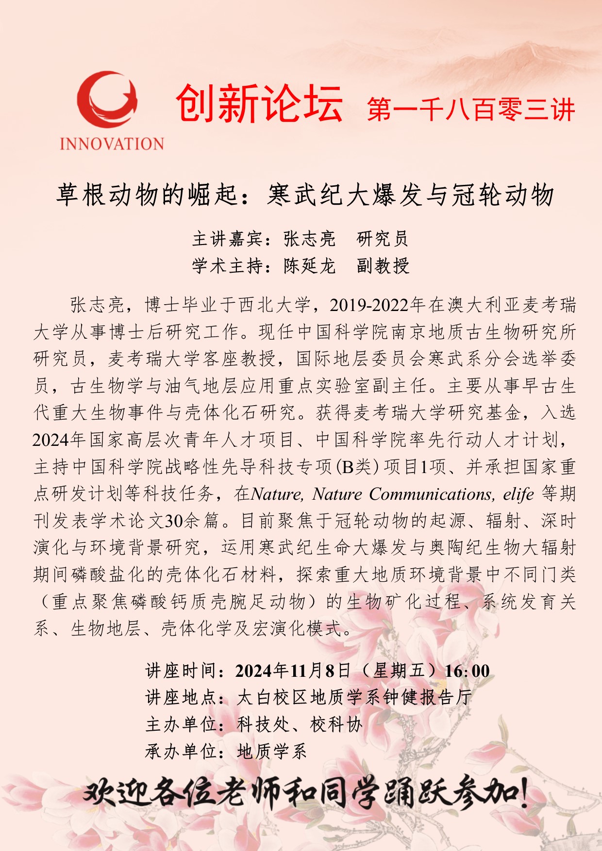 张志亮 研究员 星空app官网创新论坛第一千八百零三讲:草根动物的崛起:寒武纪大爆发与冠轮动物 讲座时间 2024年11月8日(星期五)16:00 讲座地点 太白校区地质学系钟健报告厅 讲座人介绍 张志亮 研究员 讲座内容