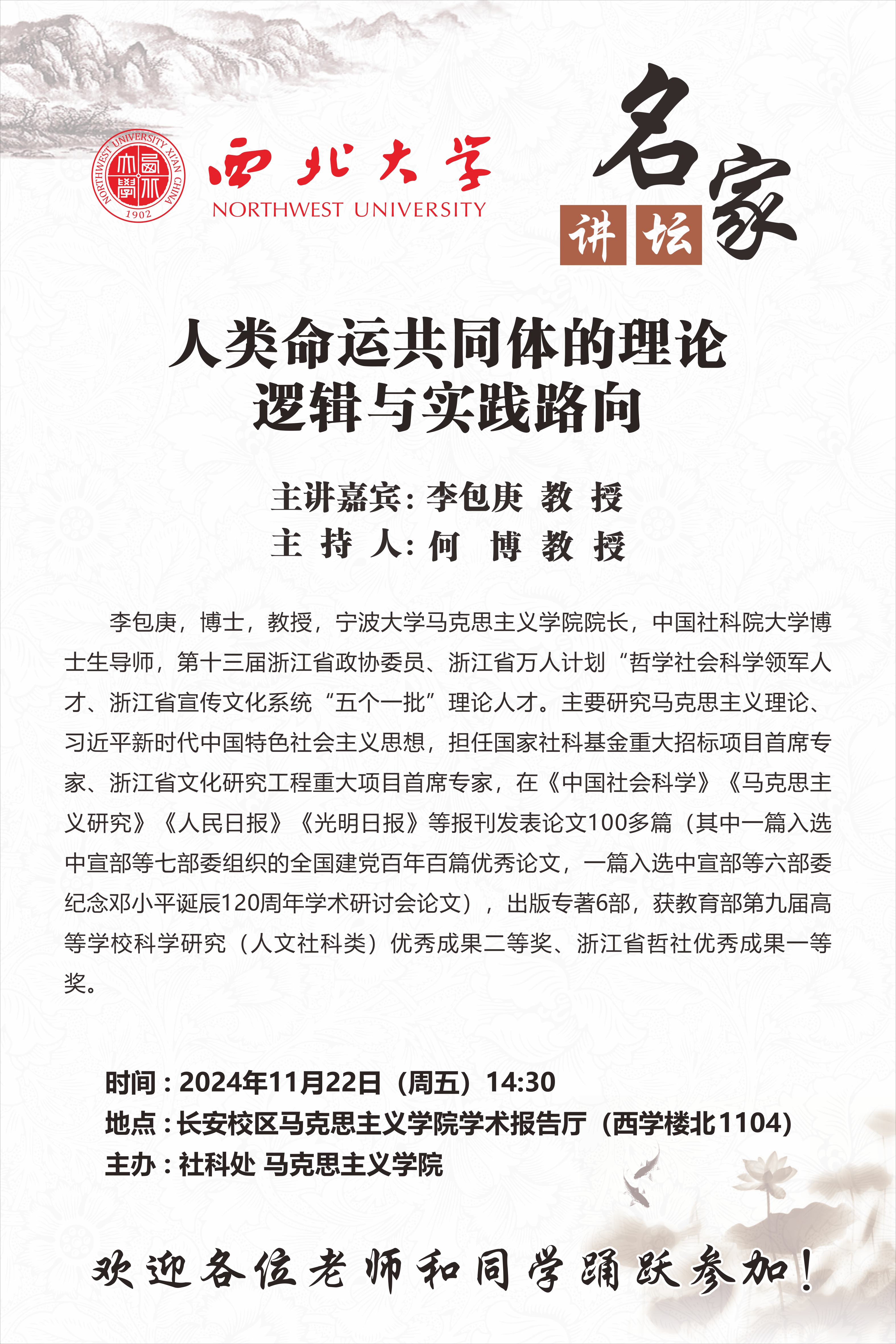 李包庚 教授 名家讲坛:人类命运共同体的理论逻辑与实践路向 讲座时间 2024年11月22日(周五)14:30 讲座地点 马克思主义学院学术报告厅(西学楼北1104) 讲座人介绍 李包庚 教授 讲座内容