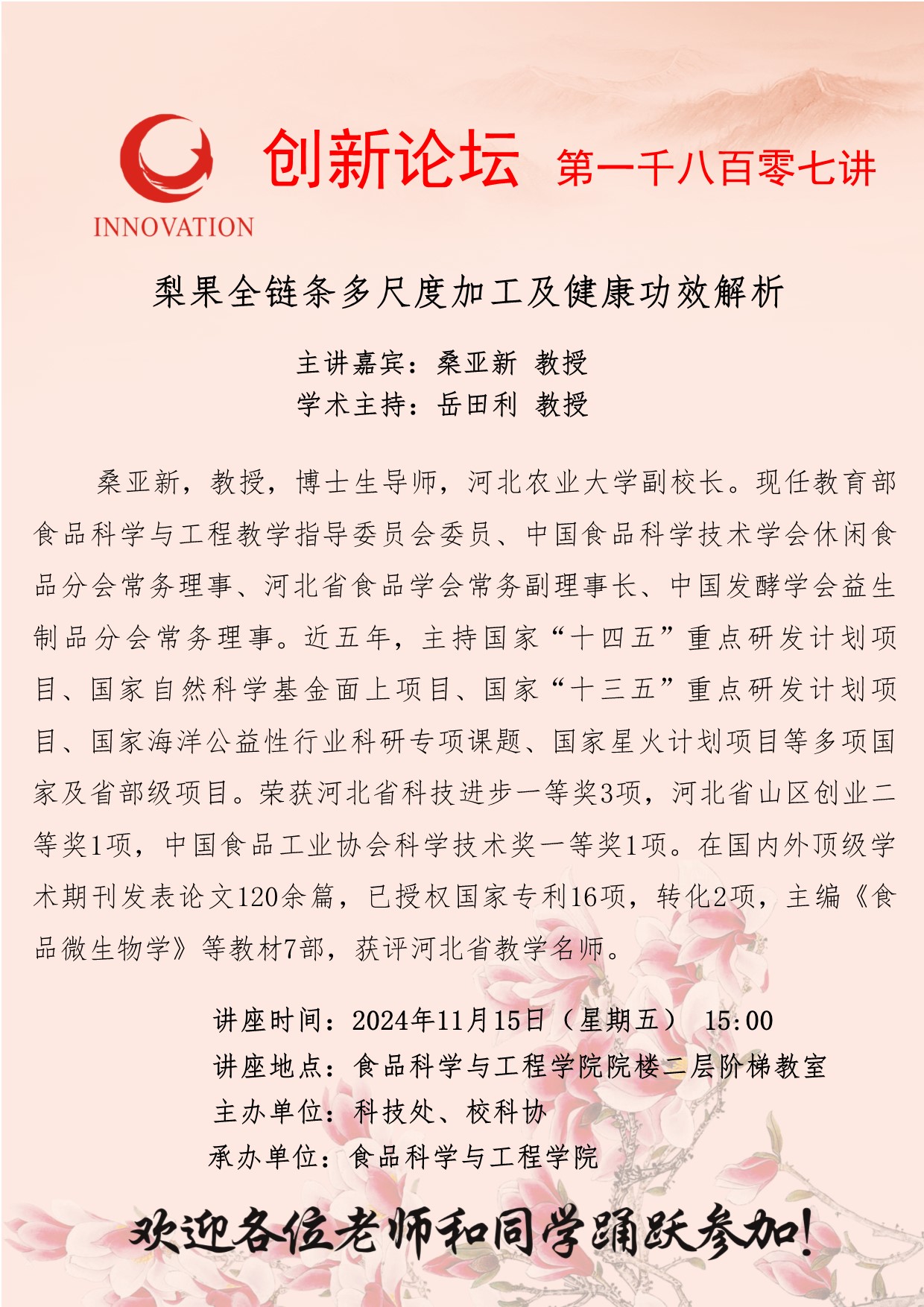 桑亚新 教授 星空app官网创新论坛第一千八百零七讲: 梨果全链条多尺度加工及健康功效解析 讲座时间 2024年11月15日(星期五) 15:00 讲座地点 食品科学与工程学院院楼二层阶梯教室 讲座人介绍 桑亚新 教授 讲座内容