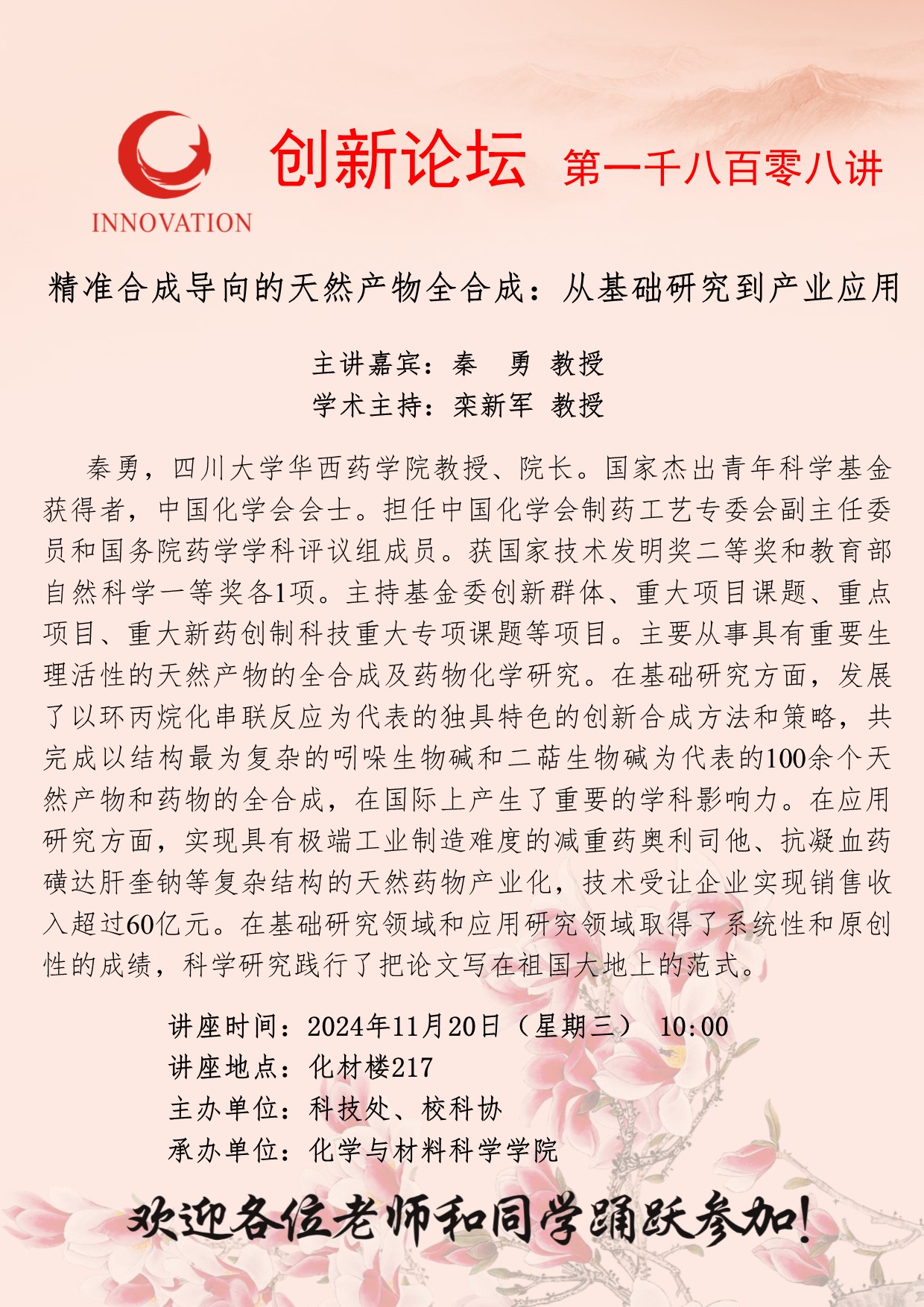 秦勇 教授 星空app官网创新论坛第一千八百零八讲:精准合成导向的天然产物全合成:从基础研究到产业应用 讲座时间 2024年11月20日(星期三) 10:00 讲座地点 化材楼217 讲座人介绍 秦勇 教授 讲座内容
