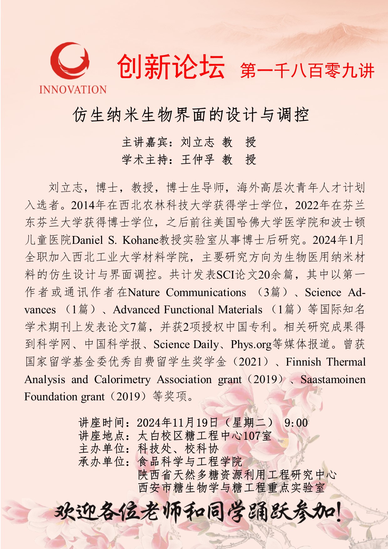 刘立志 教授 星空app官网创新论坛第一千八百零九讲:仿生纳米生物界面的设计与调控 讲座时间 2024年11月19日(星期二) 9:00 讲座地点 太白校区糖工程中心107室 讲座人介绍 刘立志 教授 讲座内容