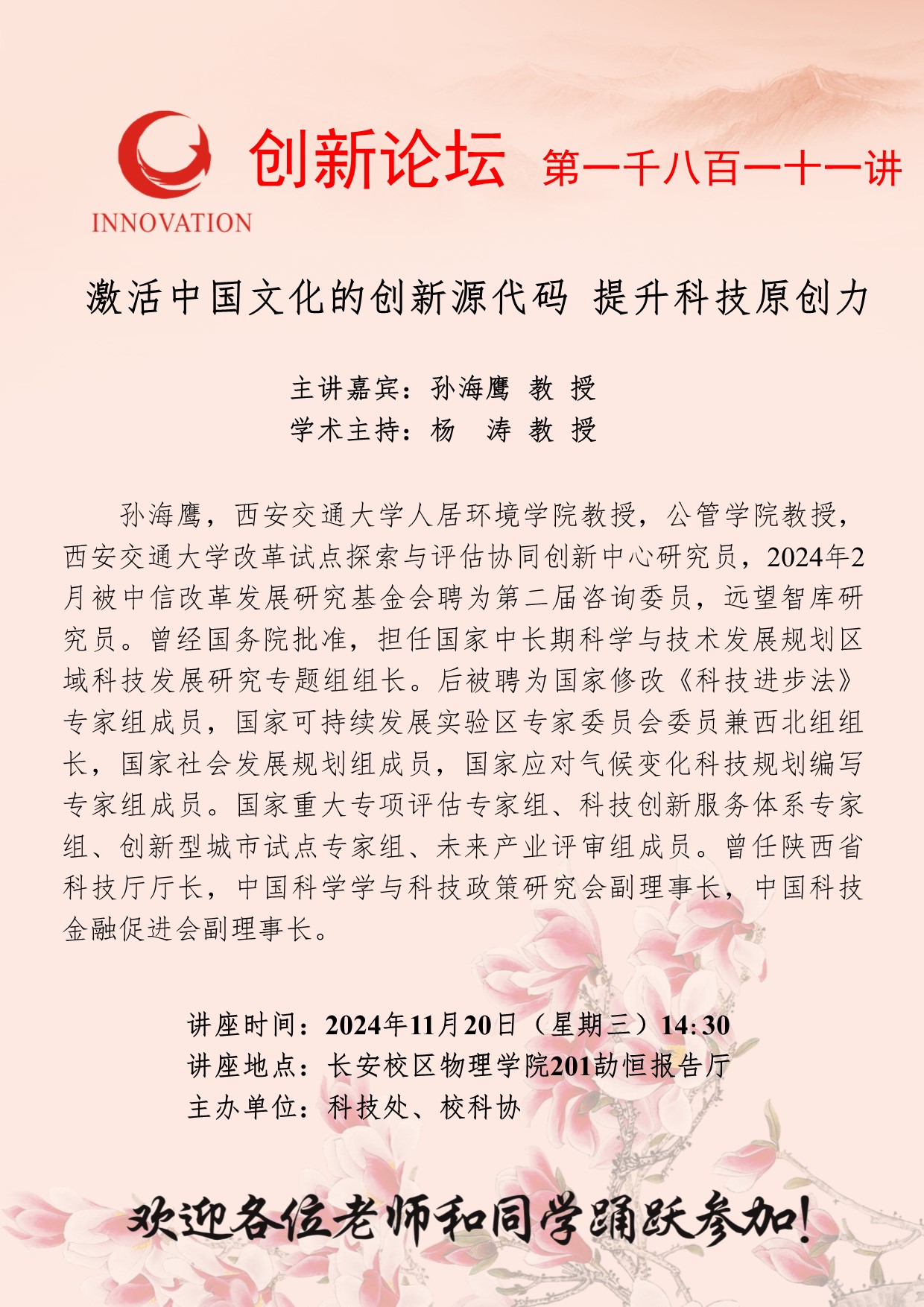 孙海鹰 教授 星空app官网创新论坛第一千八百一十一讲:激活中国文化的创新源代码 提升科技原创力 讲座时间 2024年11月20日(星期三)14:30 讲座地点 长安校区物理学院201劼恒报告厅 讲座人介绍 孙海鹰 教授 讲座内容