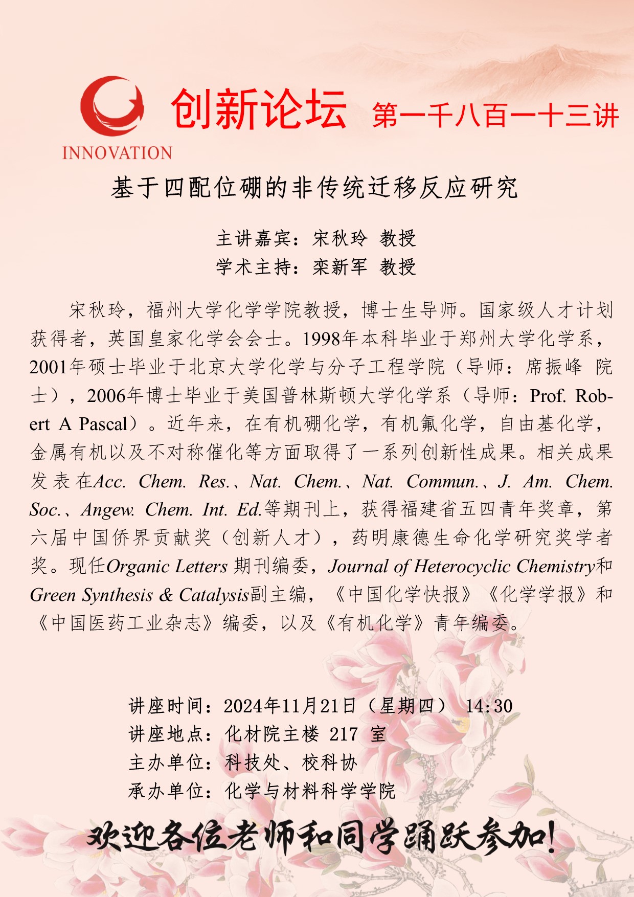 宋秋玲 教授 星空app官网创新论坛第一千八百一十三讲:基于四配位硼的非传统迁移反应研究 讲座时间 2024年11月21日(星期四) 14:30 讲座地点 化材院主楼 217 室 讲座人介绍 宋秋玲 教授 讲座内容