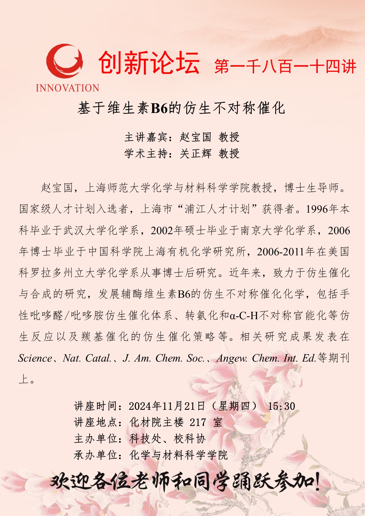 赵宝国 教授 星空app官网创新论坛第一千八百一十四讲:基于维生素B6的仿生不对称催化 讲座时间 2024年11月21日(星期四) 15:30 讲座地点 化材院主楼 217 室 讲座人介绍 赵宝国 教授 讲座内容
