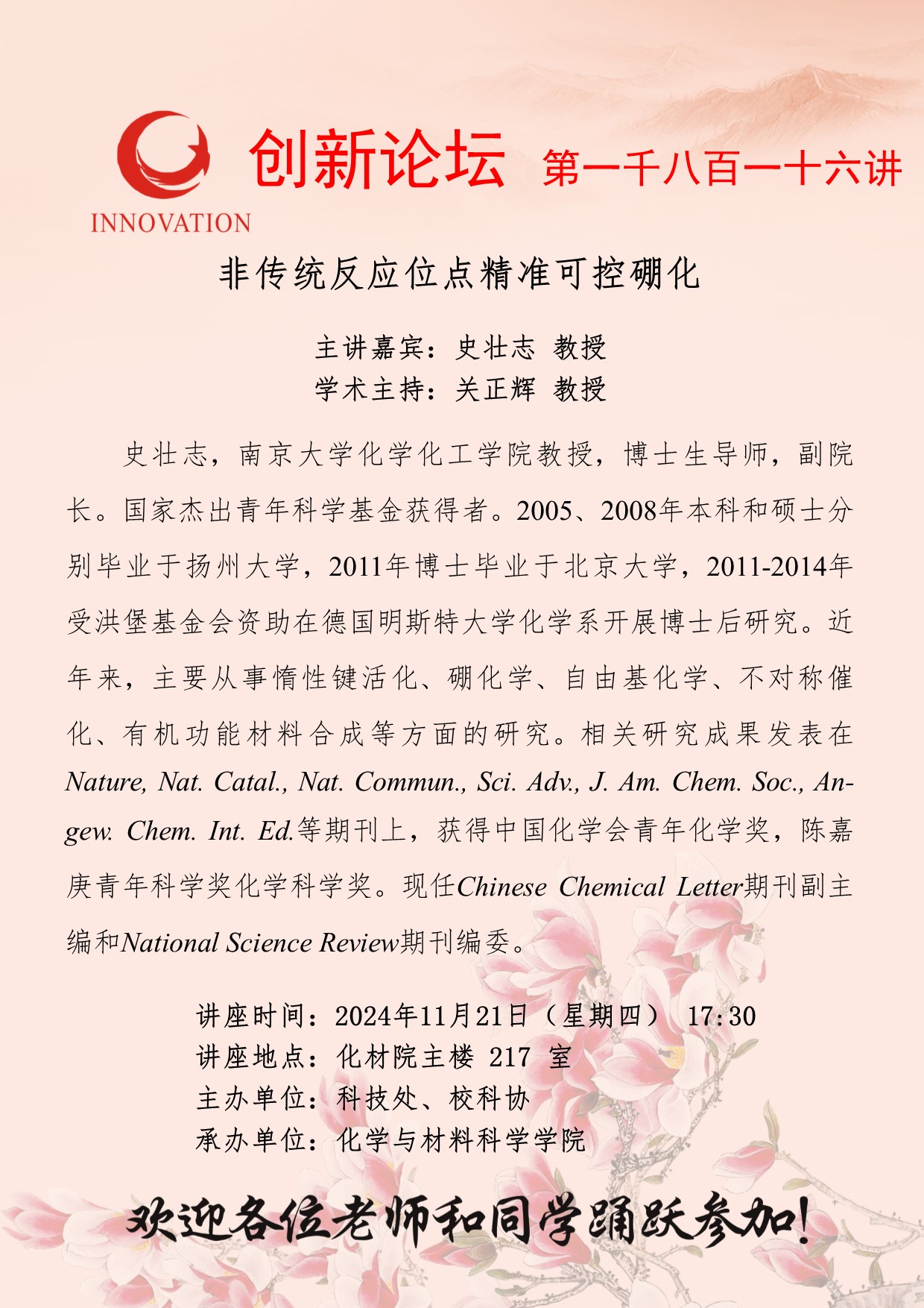 史壮志 教授 星空app官网创新论坛第一千八百一十六讲:非传统反应位点精准可控硼化 讲座时间 2024年11月21日(星期四) 17:30 讲座地点 化材院主楼 217 室 讲座人介绍 史壮志 教授 讲座内容