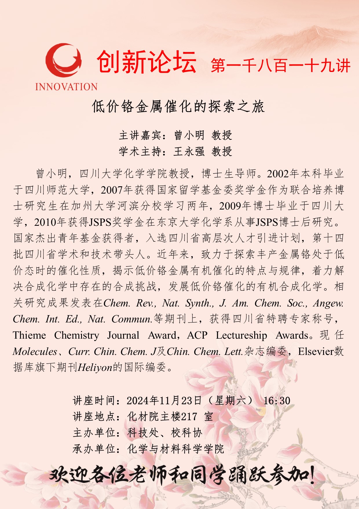 曾小明 教授 星空app官网创新论坛第一千八百一十九讲:低价铬金属催化的探索之旅 讲座时间 2024年11月23日(星期六) 16:30 讲座地点 化材院主楼217 室 讲座人介绍 曾小明 教授 讲座内容
