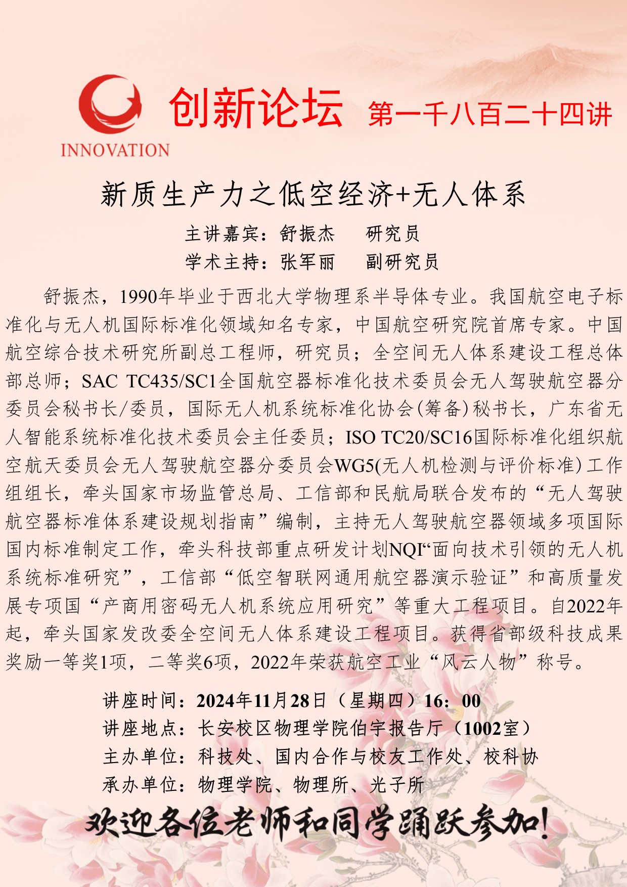 舒振杰 研究员 星空app官网创新论坛第一千八百二十四讲:新质生产力之低空经济+无人体系 讲座时间 2024年11月28日(星期四)16:00 讲座地点 长安校区物理学院伯宇报告厅(1002室) 讲座人介绍 舒振杰 研究员 讲座内容