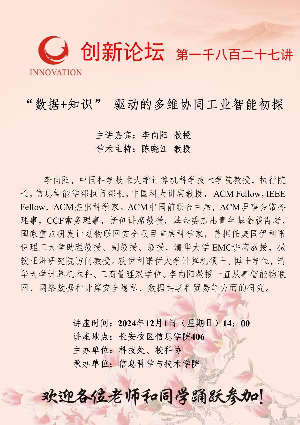 李向阳 教授 星空app官网创新论坛第一千八百二十七讲:“数据+知识” 驱动的多维协同工业智能初探 讲座时间 2024年12月1日(星期日)14:00 讲座地点 长安校区信息学院406 讲座人介绍 李向阳 教授 讲座内容