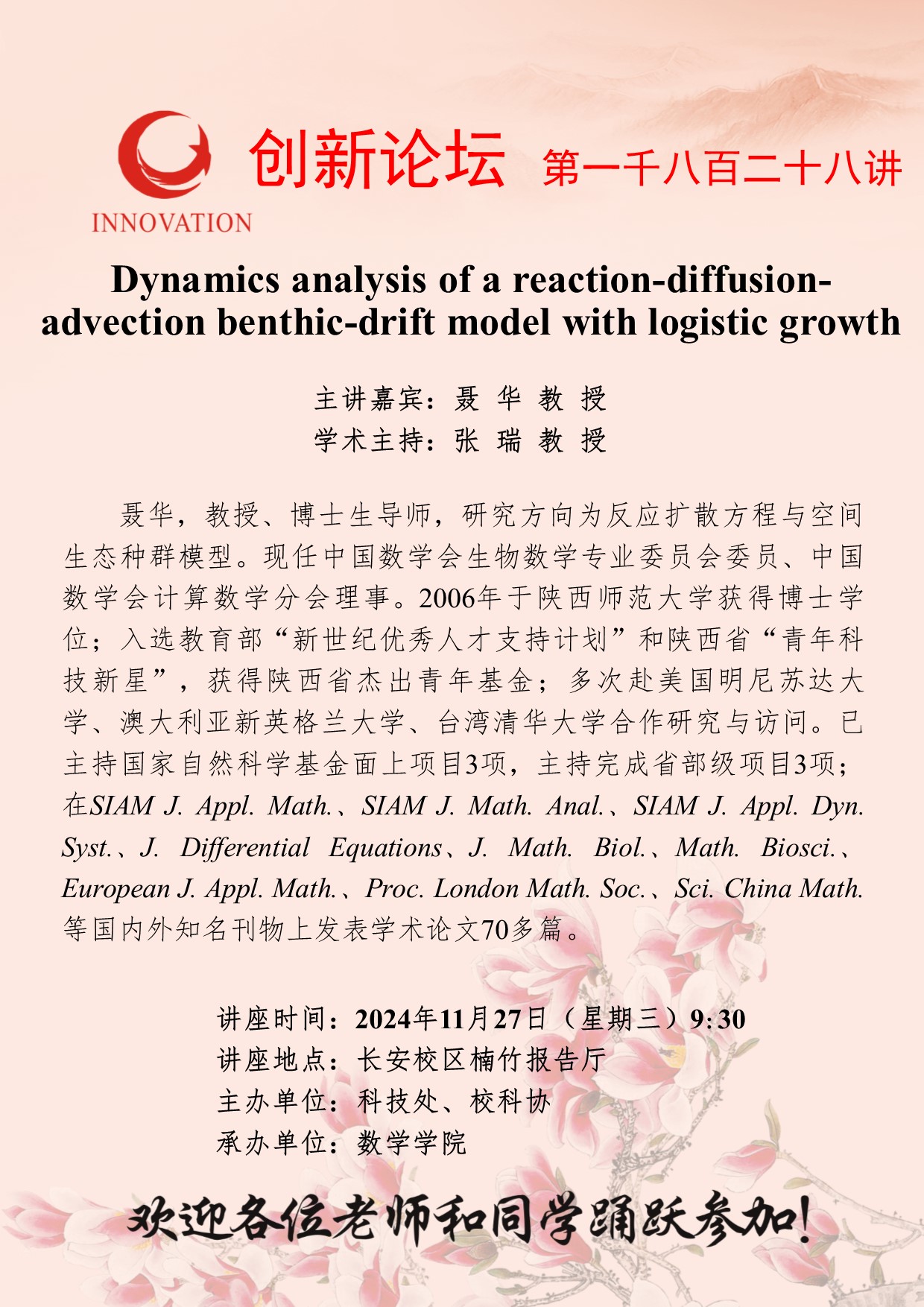 聂华 教授 星空app官网创新论坛第一千八百二十八讲:Dynamics analysis of a reaction-diffusion-advection benthic-drift model with logistic growth 讲座时间 2024年11月27日(星期三)9:30 讲座地点 长安校区楠竹报告厅 讲座人介绍 聂华 教授 讲座内容