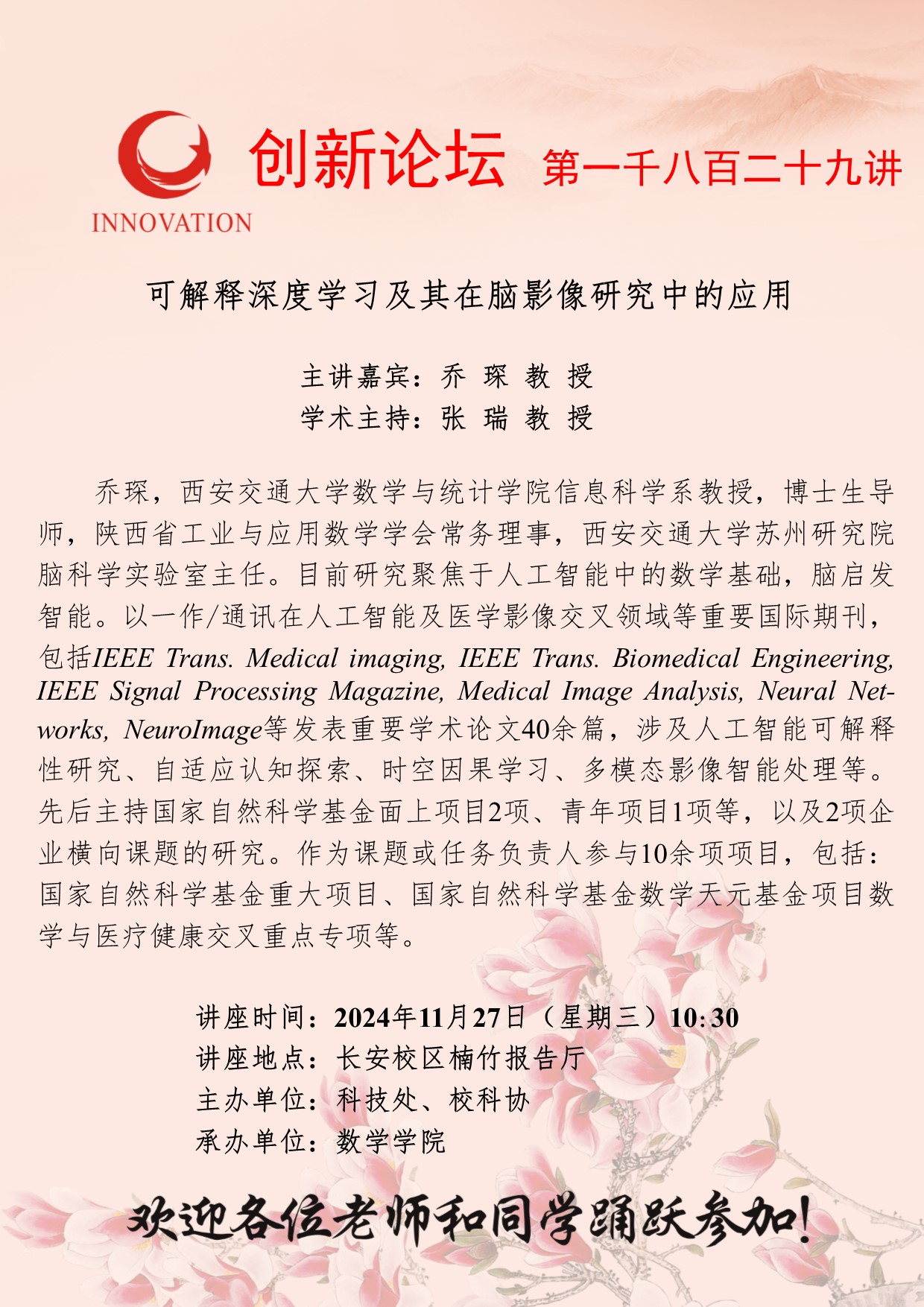乔琛 教授 星空app官网创新论坛第一千八百二十九讲:可解释深度学习及其在脑影像研究中的应用 讲座时间 2024年11月27日(星期三)10:30 讲座地点 长安校区楠竹报告厅 讲座人介绍 乔琛 教授 讲座内容