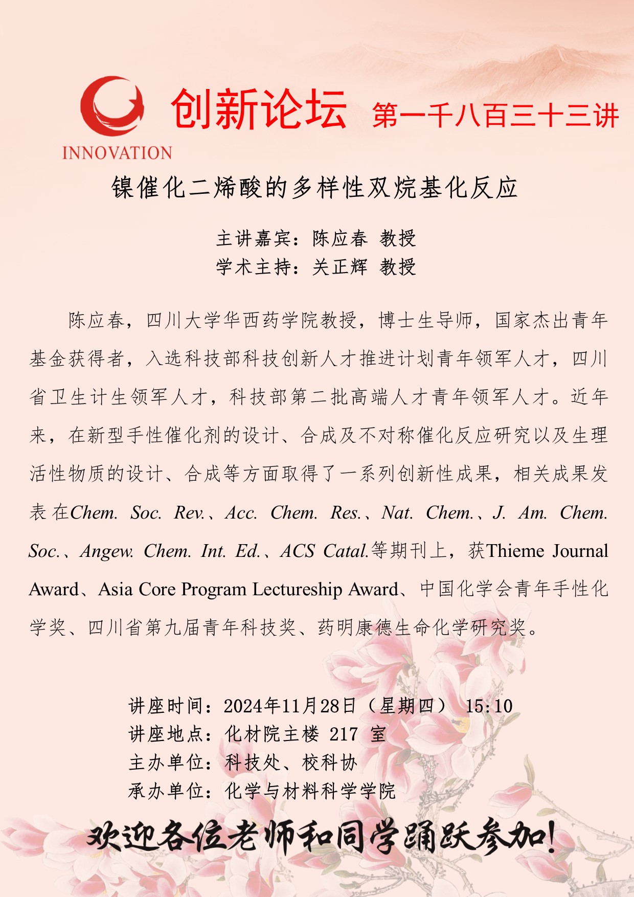 陈应春 教授 星空app官网创新论坛第一千八百三十三讲:镍催化二烯酸的多样性双烷基化反应 讲座时间 2024年11月28日(星期四) 15:10 讲座地点 化材院主楼217室 讲座人介绍 陈应春 教授 讲座内容