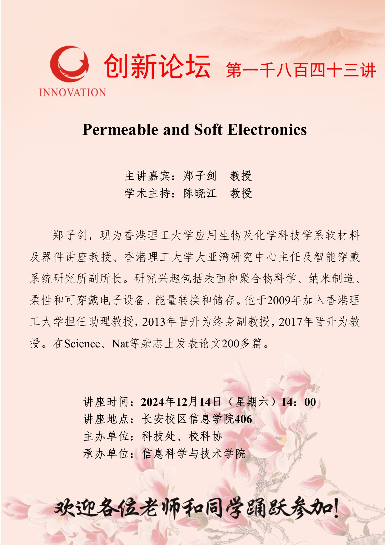 郑子剑 教授 星空app官网创新论坛第一千八百四十三讲:Permeable and Soft Electronics 讲座时间 2024年12月14日(星期六)14:00 讲座地点 长安校区信息学院406 讲座人介绍 郑子剑 教授 讲座内容