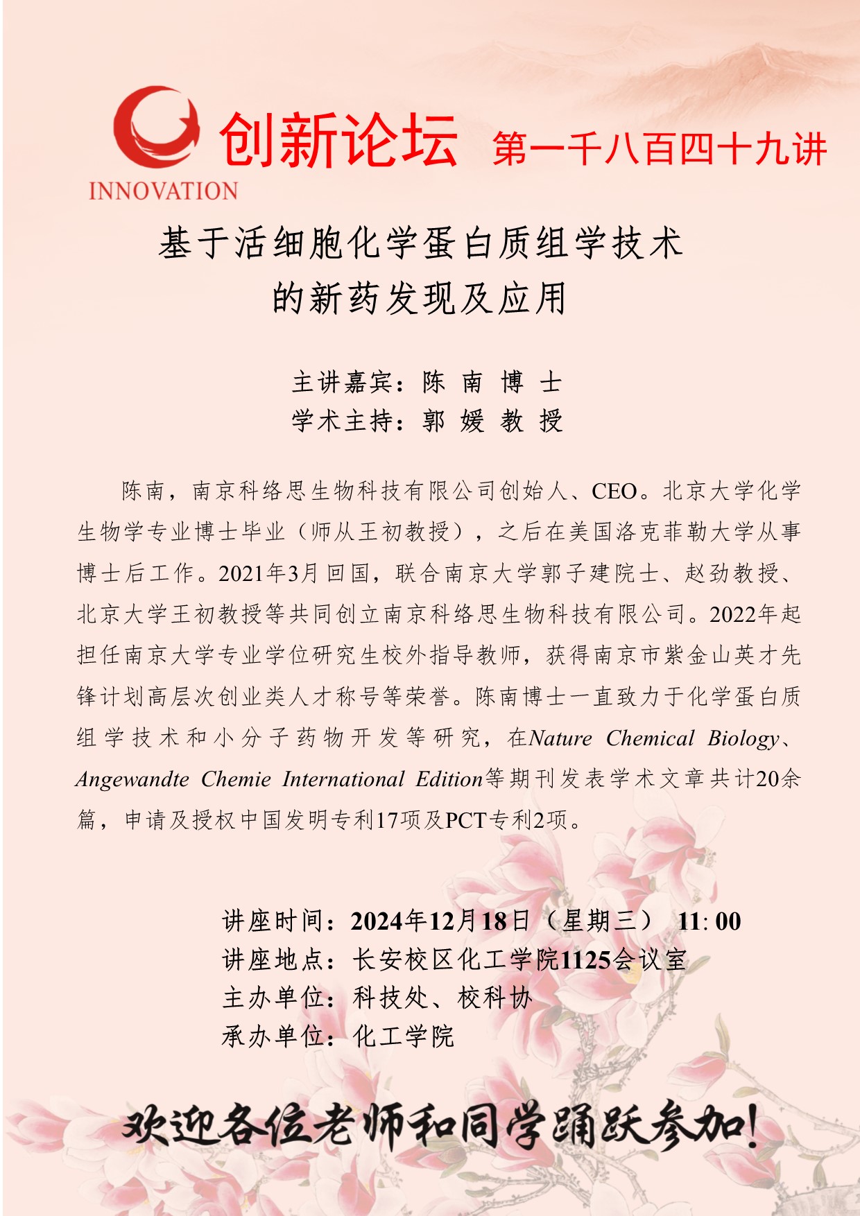 陈南 博士 星空app官网创新论坛第一千八百四十九讲:基于活细胞化学蛋白质组学技术的新药发现及应用 讲座时间 2024年12月18日(星期三)11: 00 讲座地点 长安校区化工学院1125会议室 讲座人介绍 陈南 博士 讲座内容