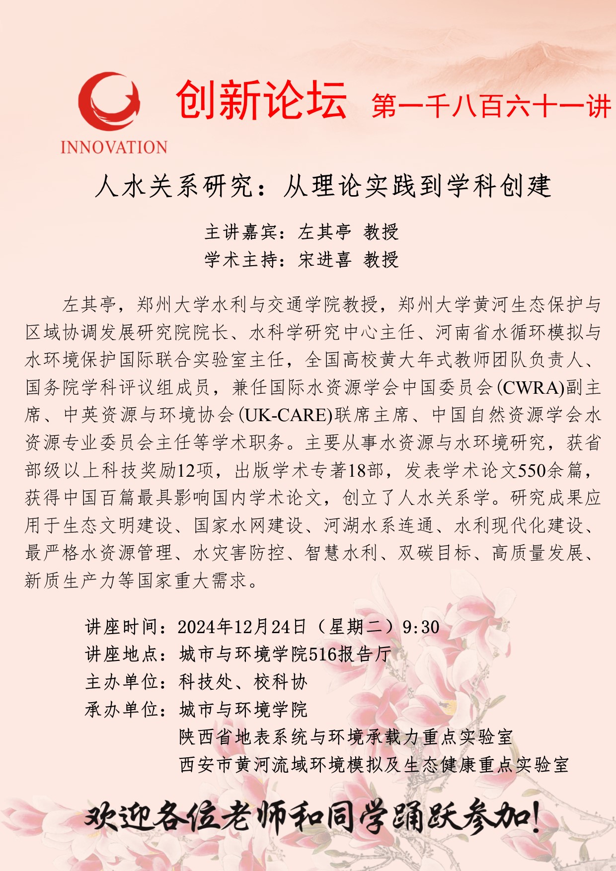 左其亭 教授 星空app官网创新论坛第一千八百六十一讲:人水关系研究:从理论实践到学科创建 讲座时间 2024年12月24日(星期二)9:30 讲座地点 城市与环境学院516报告厅 讲座人介绍 左其亭 教授 讲座内容