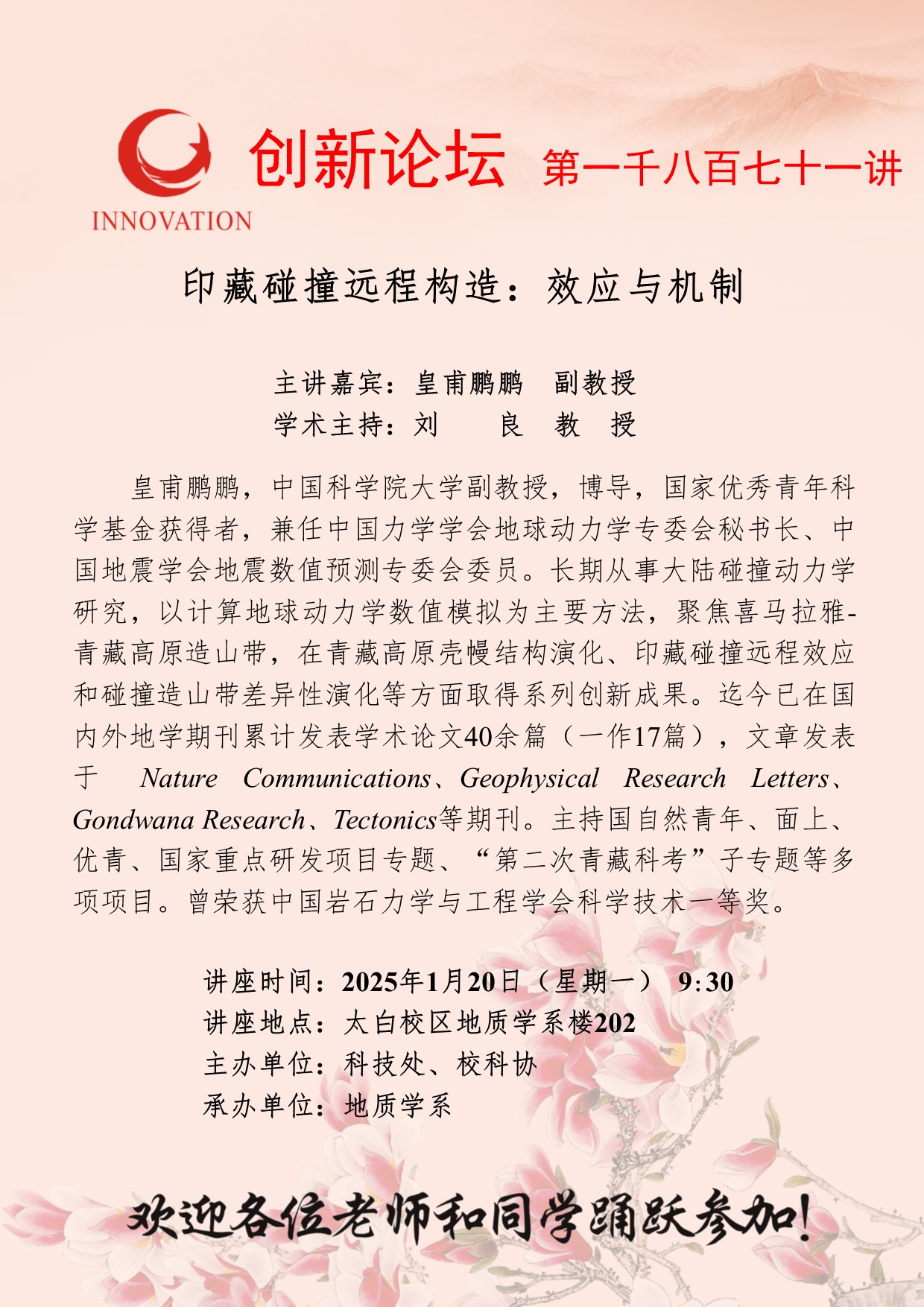 皇甫鹏鹏 副教授 星空app官网创新论坛第一千八百七十一讲:印藏碰撞远程构造:效应与机制 讲座时间 2025年1月20日(星期一) 9:30 讲座地点 太白校区地质学系楼202 讲座人介绍 皇甫鹏鹏 副教授 讲座内容