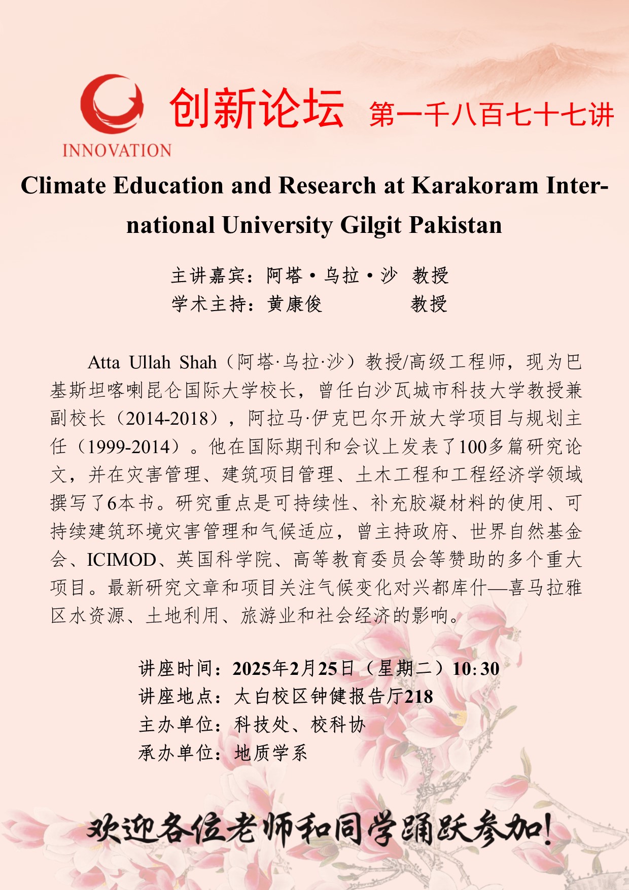 阿塔·乌拉·沙 教授 星空app官网创新论坛第一千八百七十七讲:Climate Education and Research at Karakoram International University Gilgit Pakistan 讲座时间 2025年2月25日(星期二)10:30 讲座地点 太白校区钟健报告厅218 讲座人介绍 阿塔·乌拉·沙 教授 讲座内容