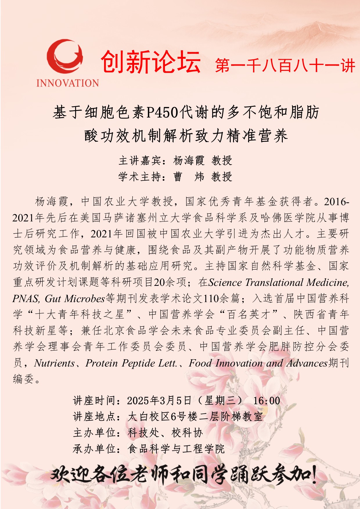 杨海霞 教授 星空app官网创新论坛第一千八百八十一讲:基于细胞色素P450代谢的多不饱和脂肪酸功效机制解析致力精准营养 讲座时间 2025年3月5日(星期三)16:00 讲座地点 太白校区6号楼二层阶梯教室 讲座人介绍 杨海霞 教授 讲座内容
