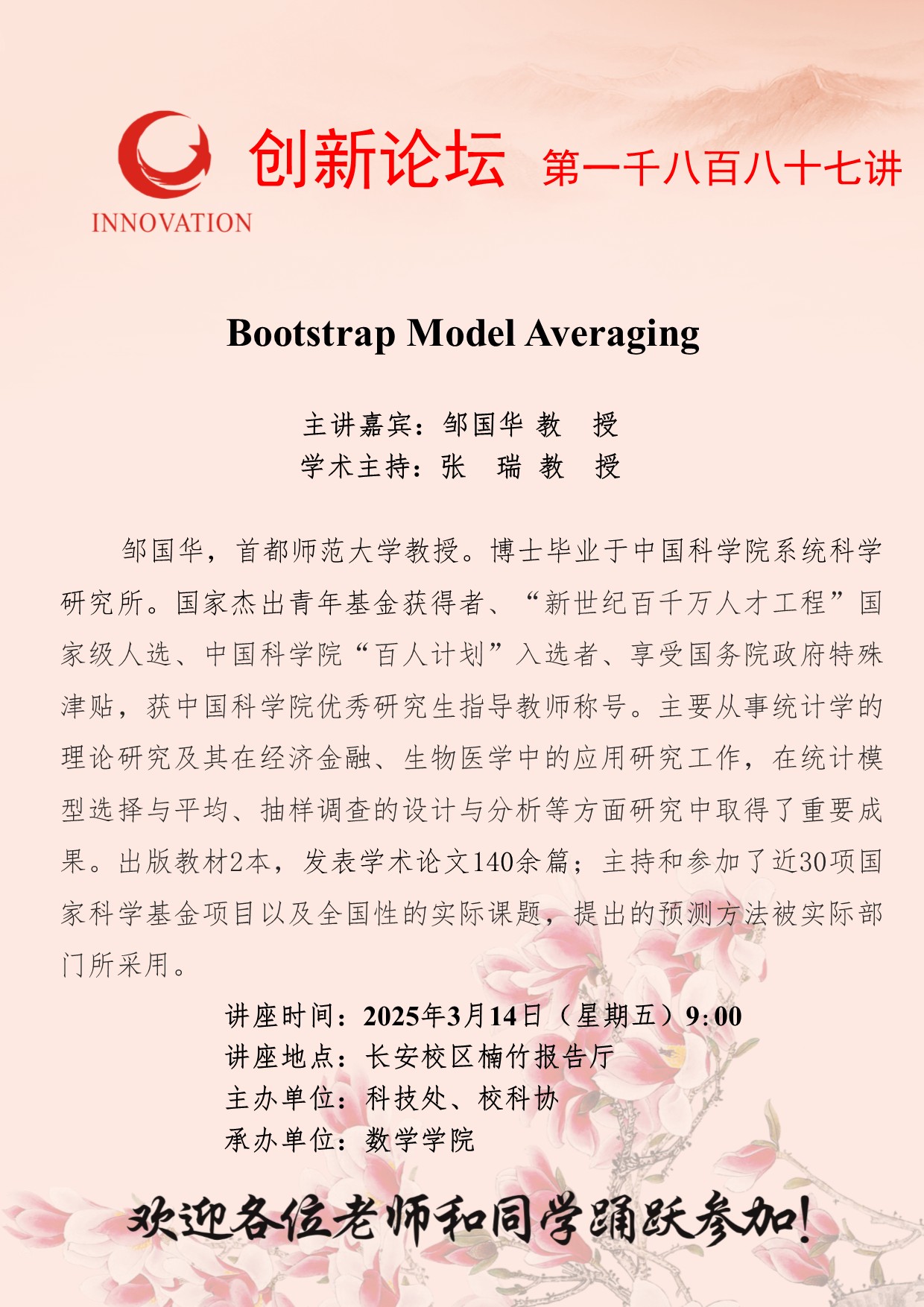 邹国华 教授 星空app官网创新论坛第一千八百八十七讲:Bootstrap Model Averaging 讲座时间 2025年3月14日(星期五)9:00 讲座地点 长安校区楠竹报告厅 讲座人介绍 邹国华 教授 讲座内容