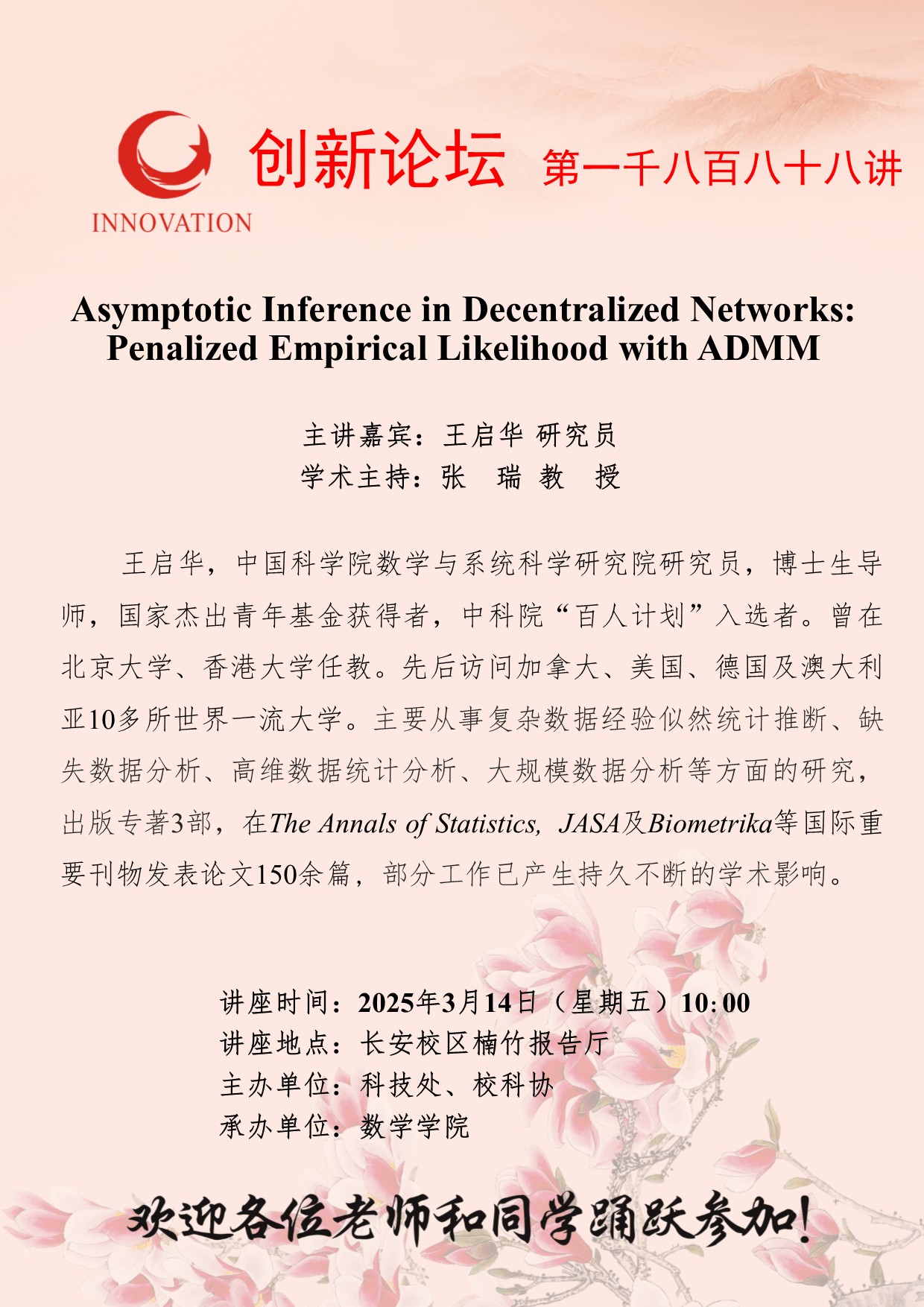 王启华 研究员 星空app官网创新论坛第一千八百八十八讲:Asymptotic Inference in Decentralized Networks: Penalized Empirical Likelihood with ADMM 讲座时间 2025年3月14日(星期五)10:00 讲座地点 长安校区楠竹报告厅 讲座人介绍 王启华 研究员 讲座内容