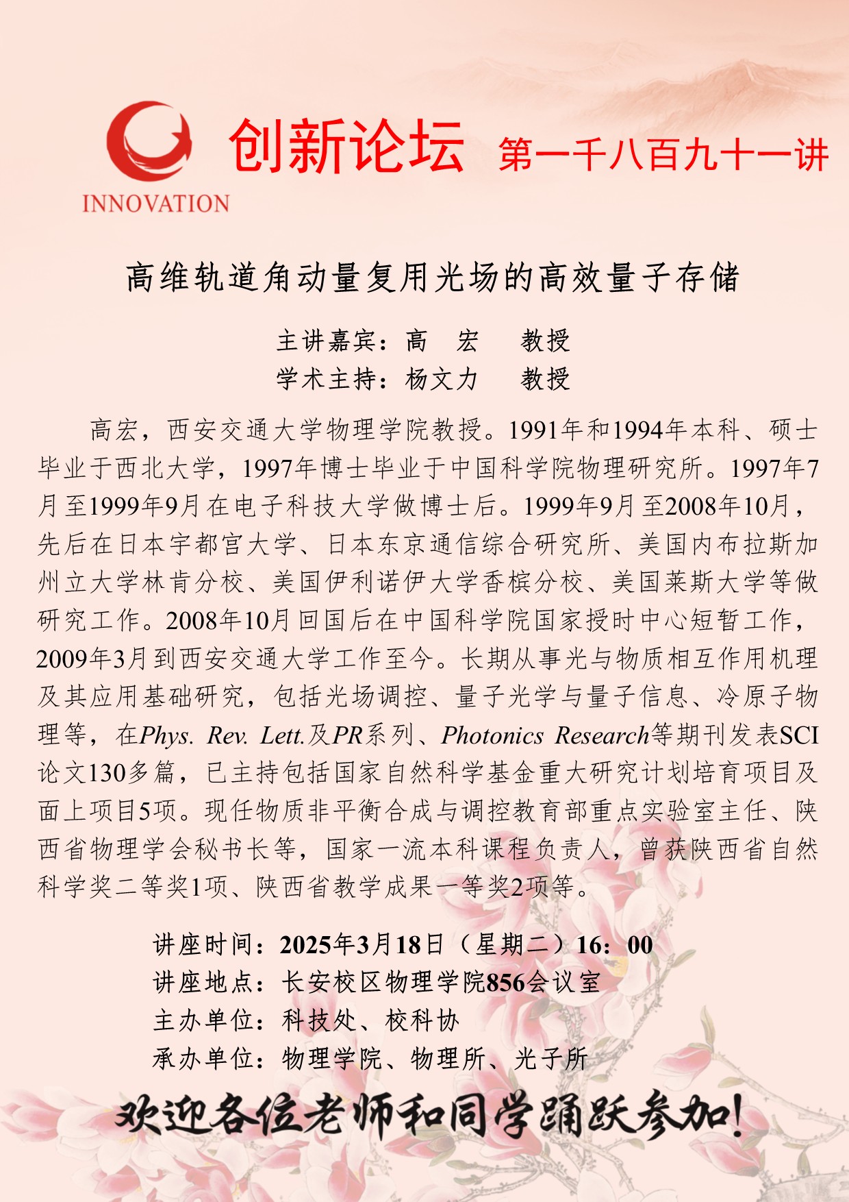 高宏 教授 星空app官网创新论坛第一千八百九十一讲:高维轨道角动量复用光场的高效量子存储 讲座时间 2025年3月18日(星期二)16:00 讲座地点 长安校区物理学院856会议室 讲座人介绍 高宏 教授 讲座内容